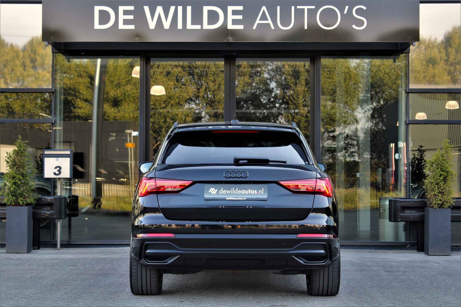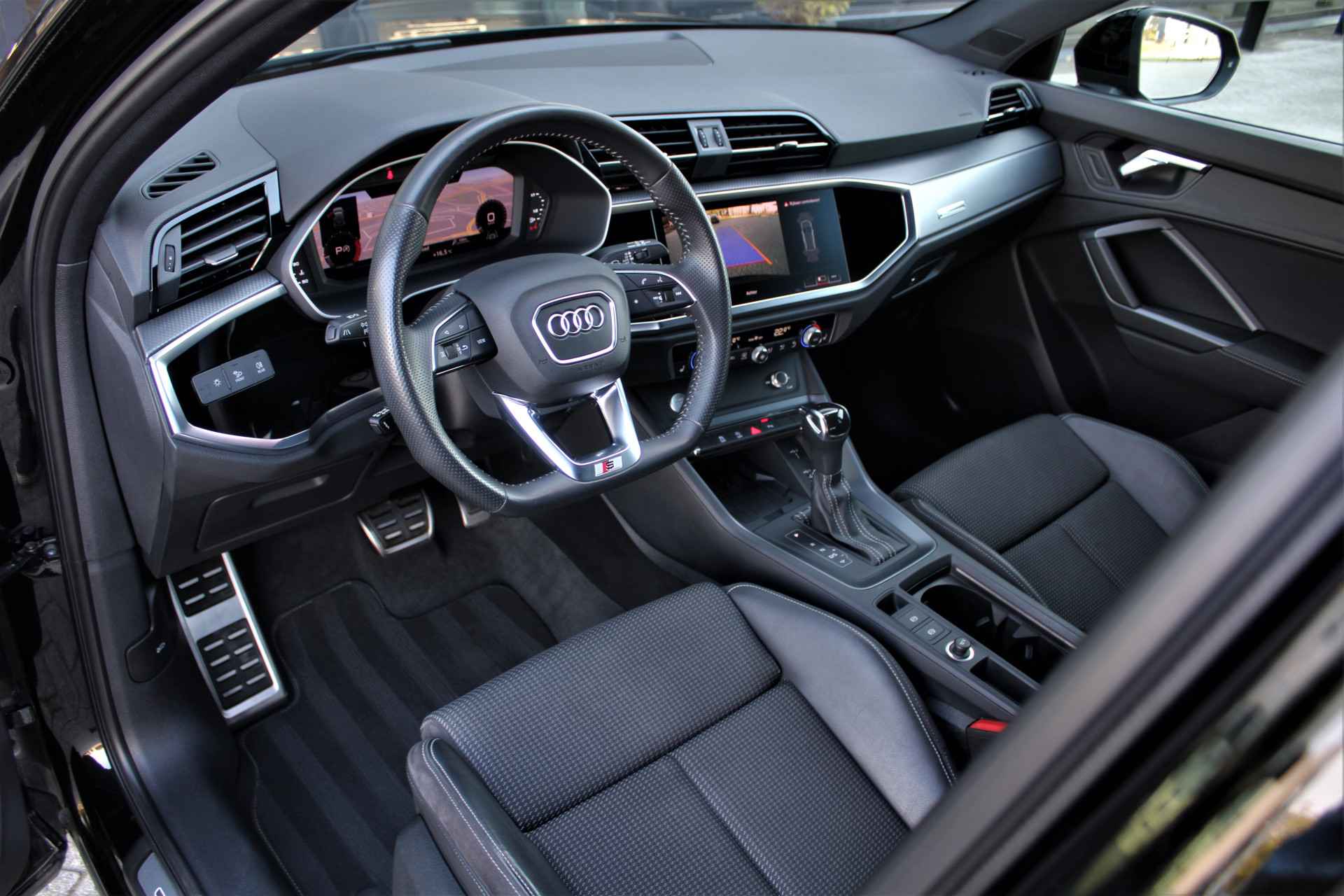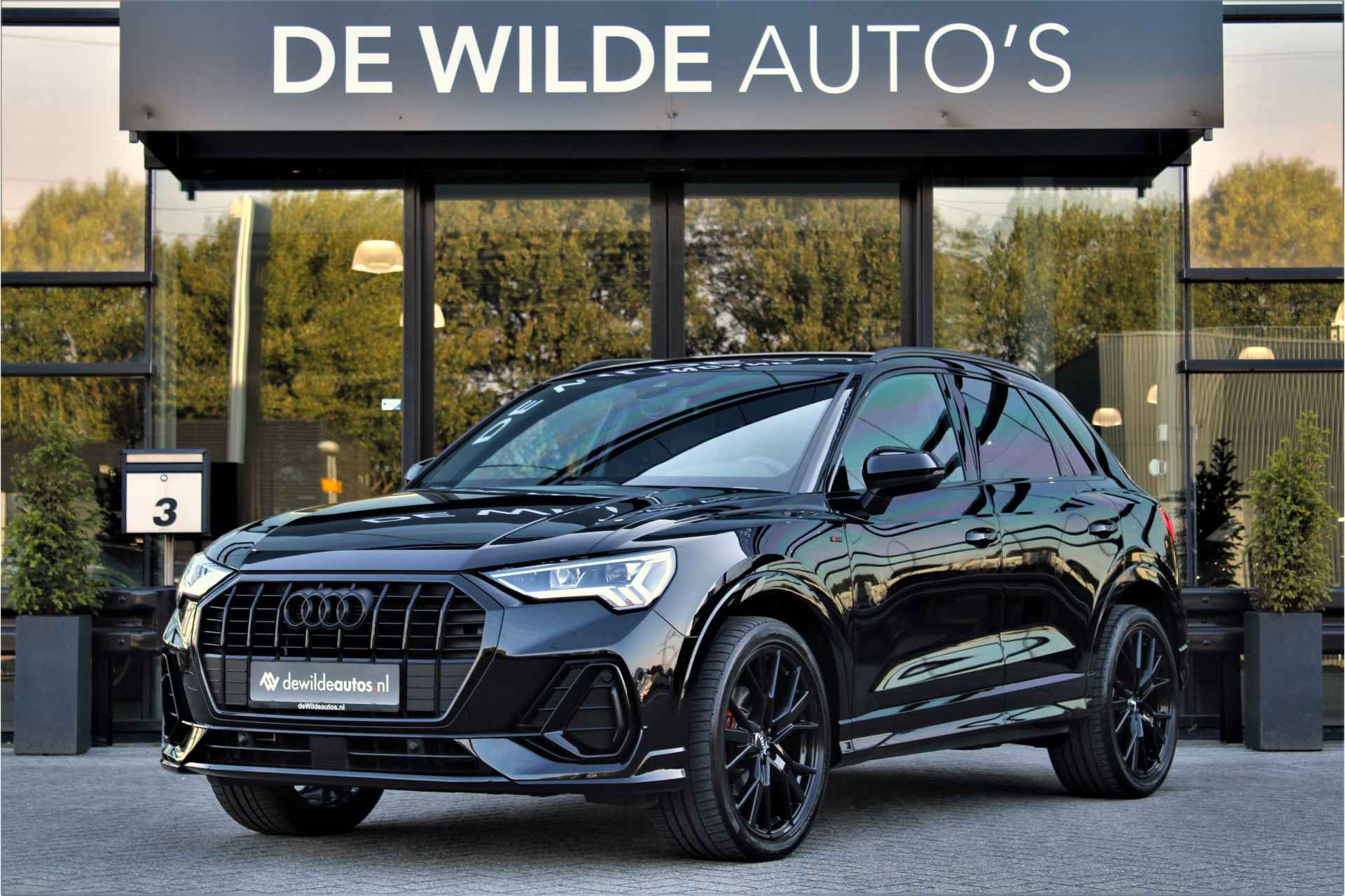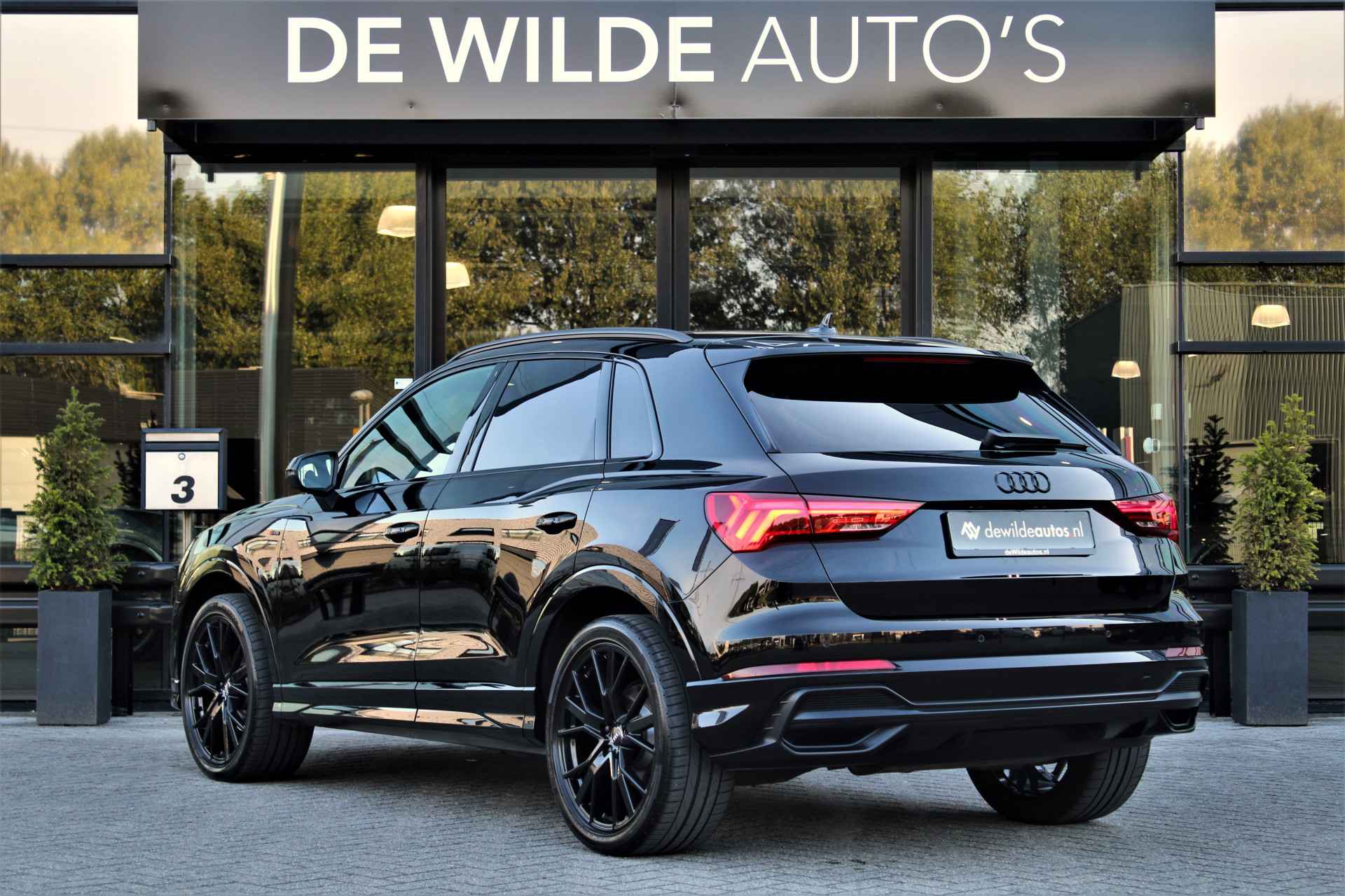 Audi Q3 35 TFSI S-line in de kleur 'Mythoszwart Metallic'. De Q3 is voorzien van een 1.5 benzinemotor die zorgt voor een vermogen van 150 pk, gecombineerd met automatische transmissie.