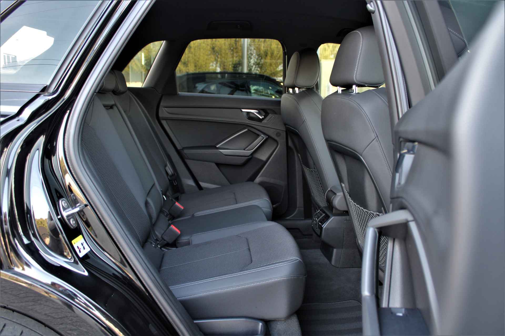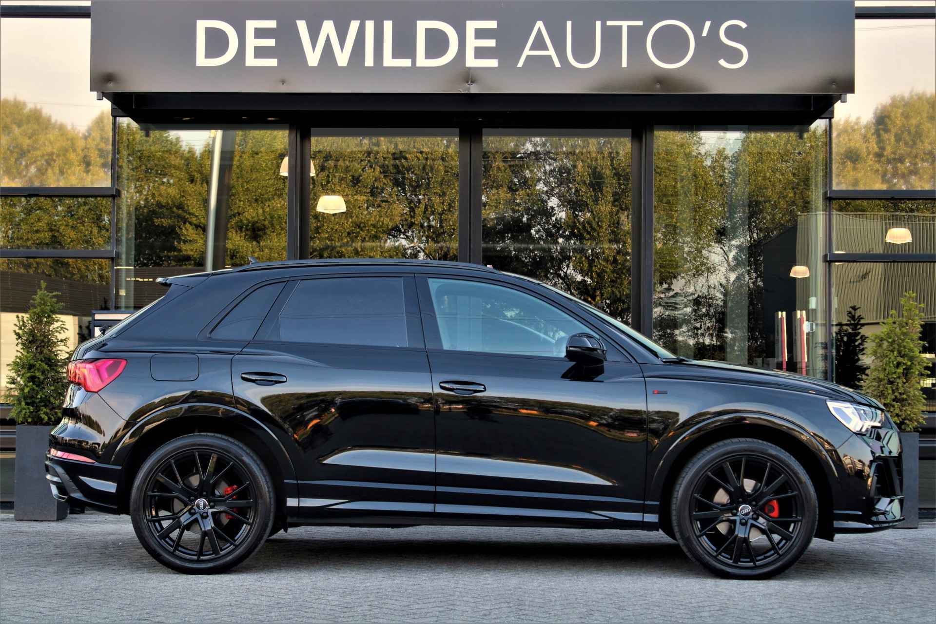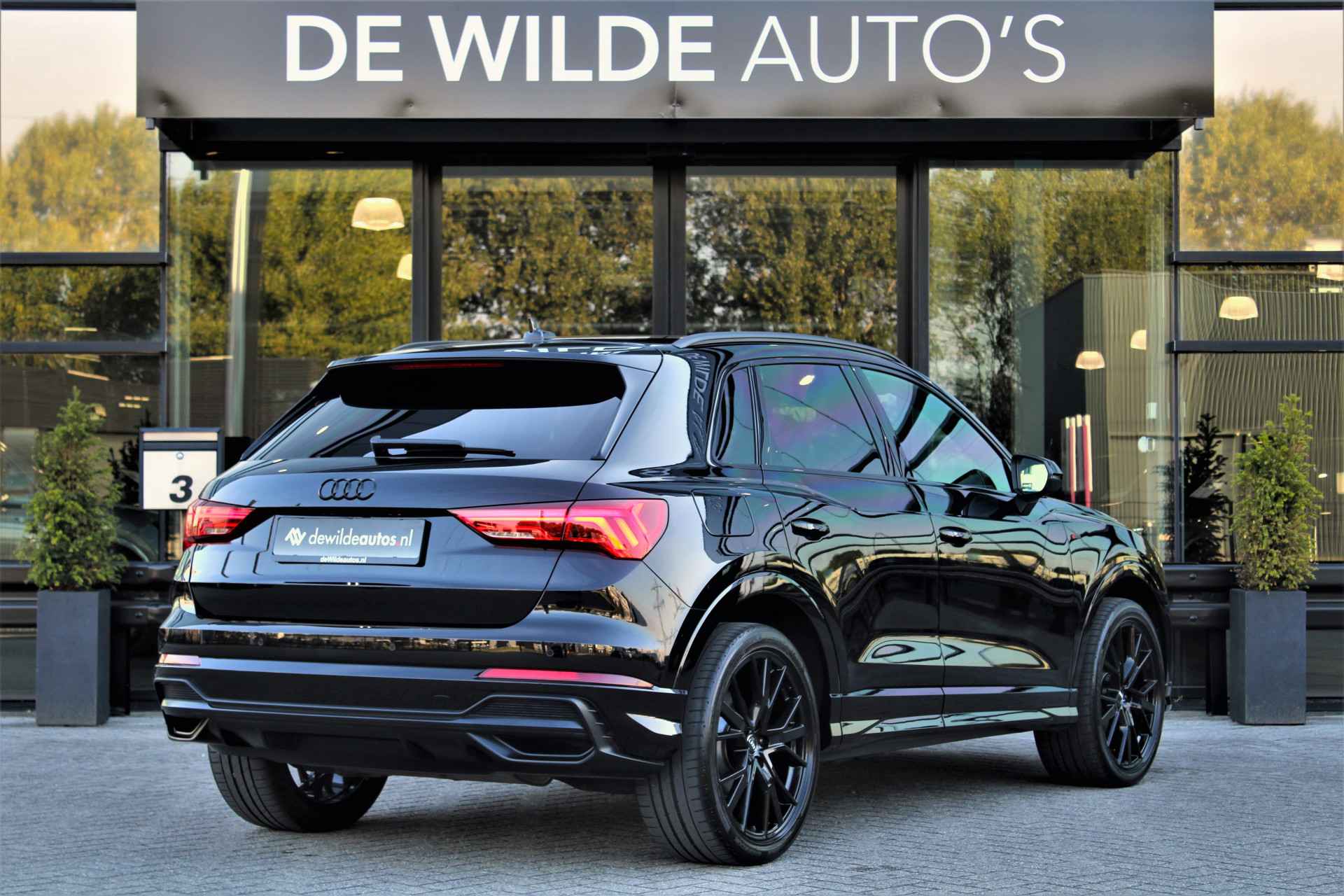 Audi Q3 35 TFSI S-line in de kleur 'Mythoszwart Metallic'. De Q3 is voorzien van een 1.5 benzinemotor die zorgt voor een vermogen van 150 pk, gecombineerd met automatische transmissie.