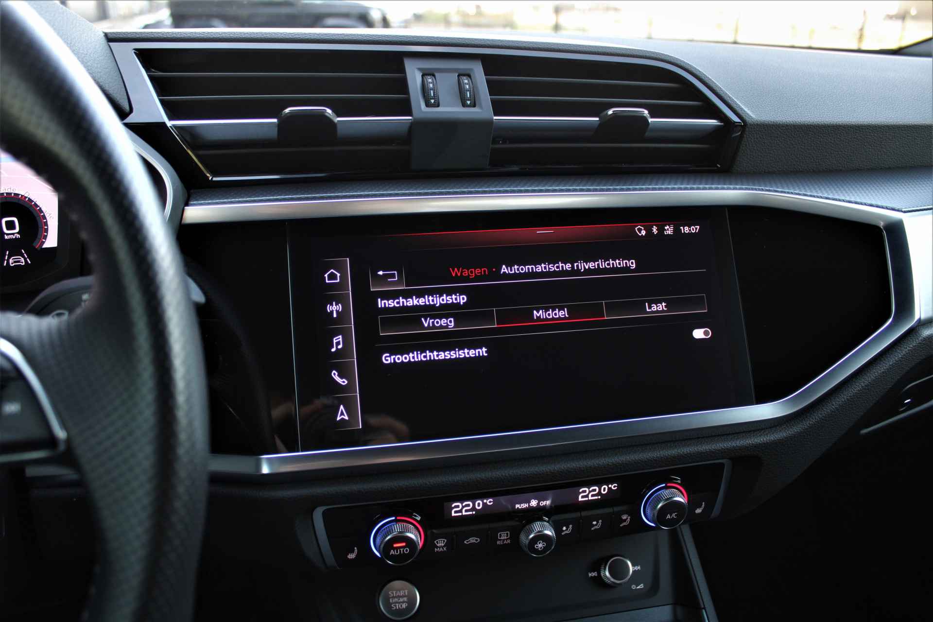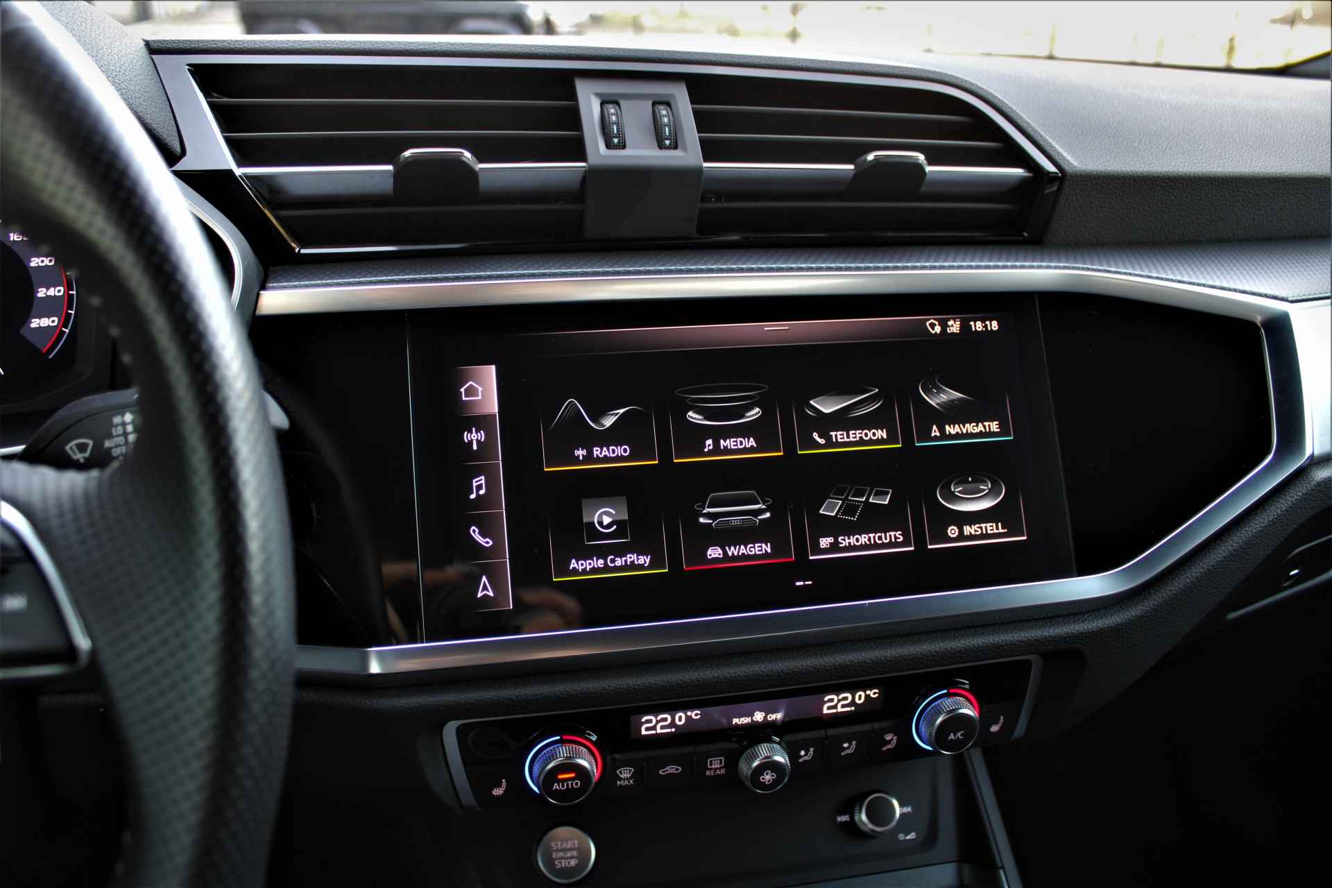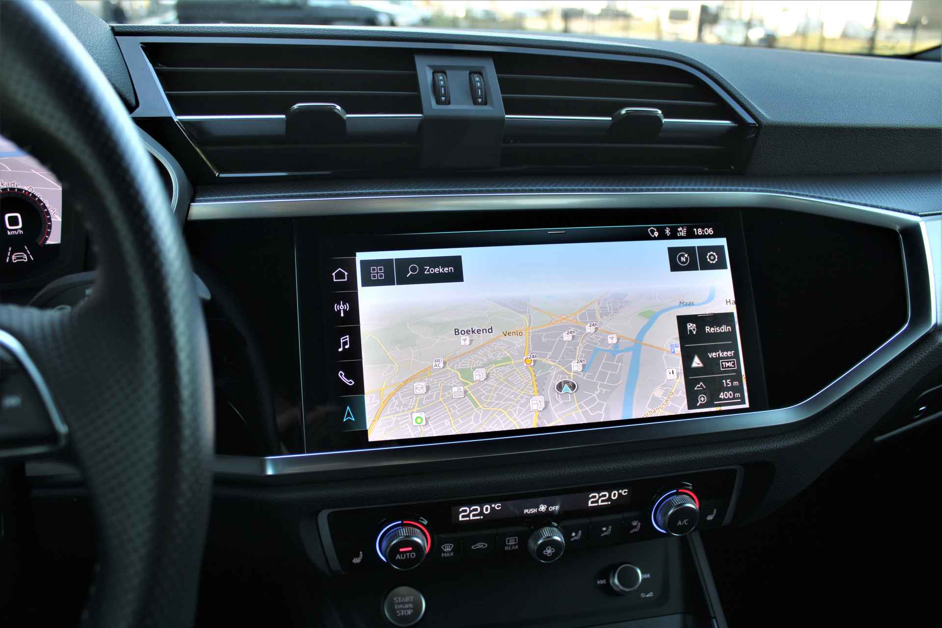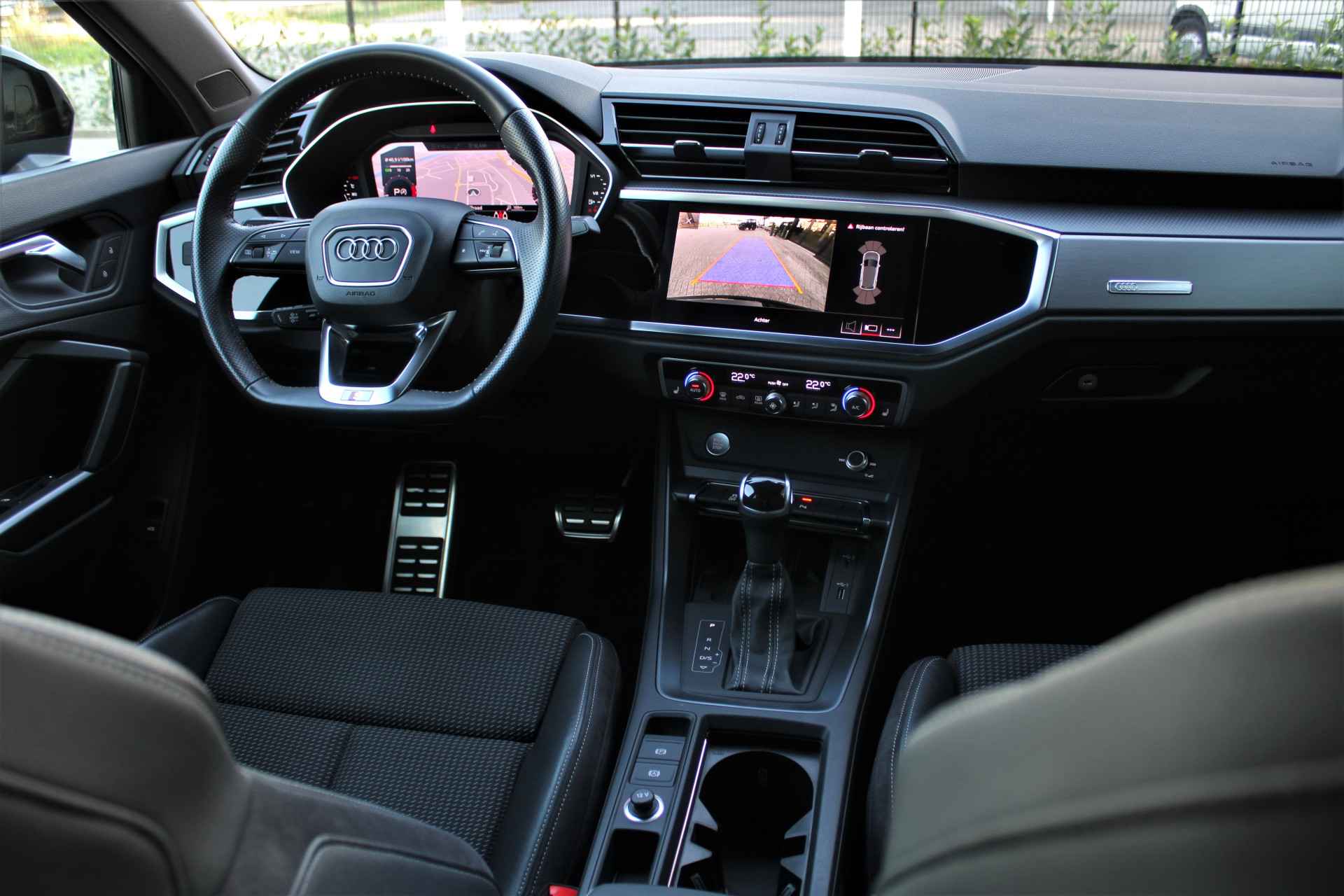 Audi Q3 35 TFSI S-line in de kleur 'Mythoszwart Metallic'. De Q3 is voorzien van een 1.5 benzinemotor die zorgt voor een vermogen van 150 pk, gecombineerd met automatische transmissie.