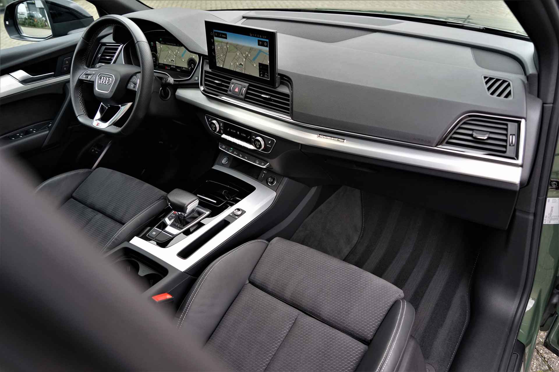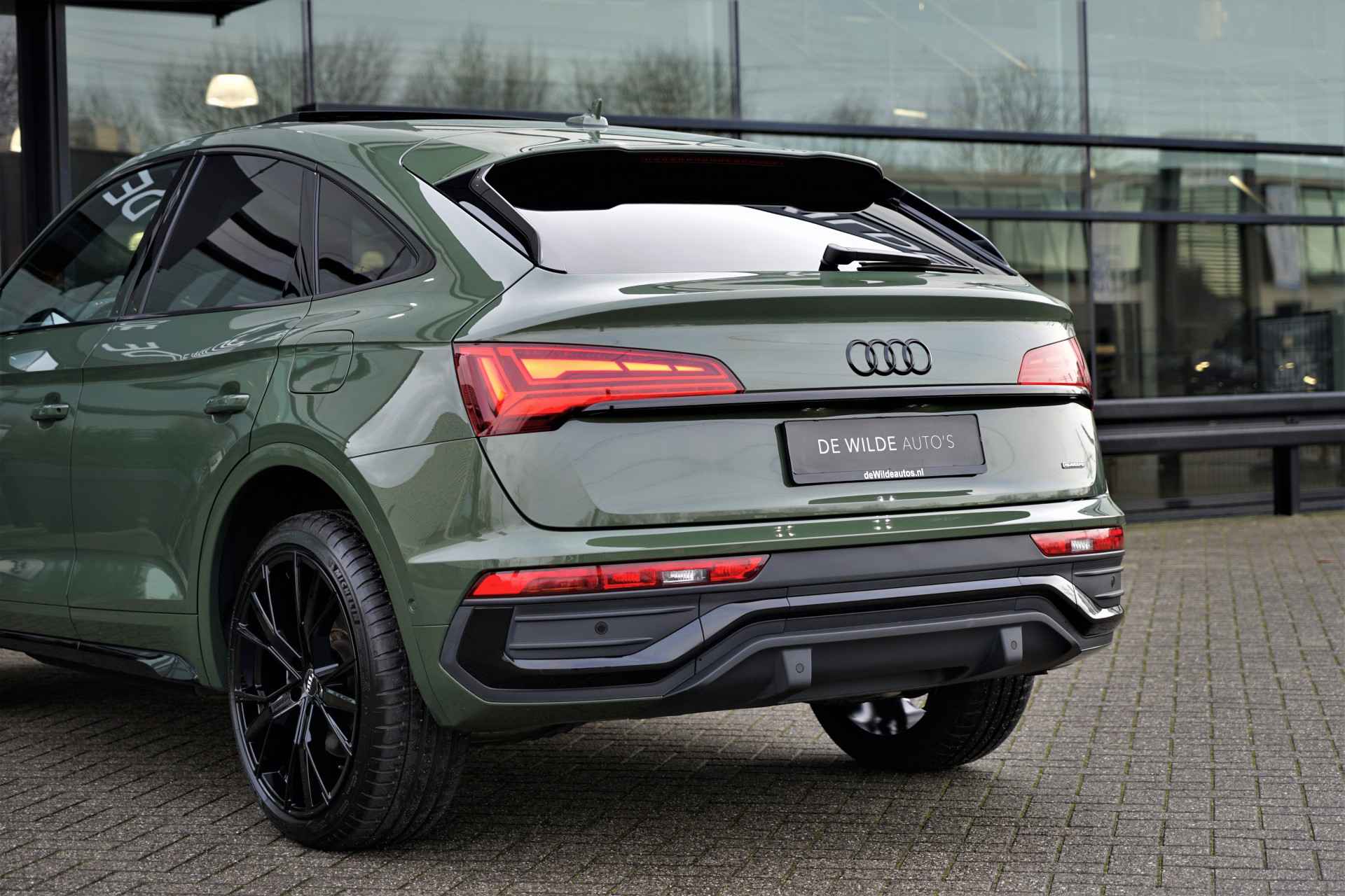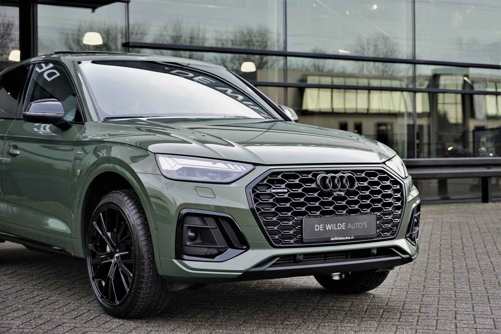 Audi Q5 Sportback 50 TFSI e Quattro S-line in de prachtige kleur 'District Groen metallic'. De auto is compleet Audi dealer onderhouden en heeft slechts één eigenaar gehad.