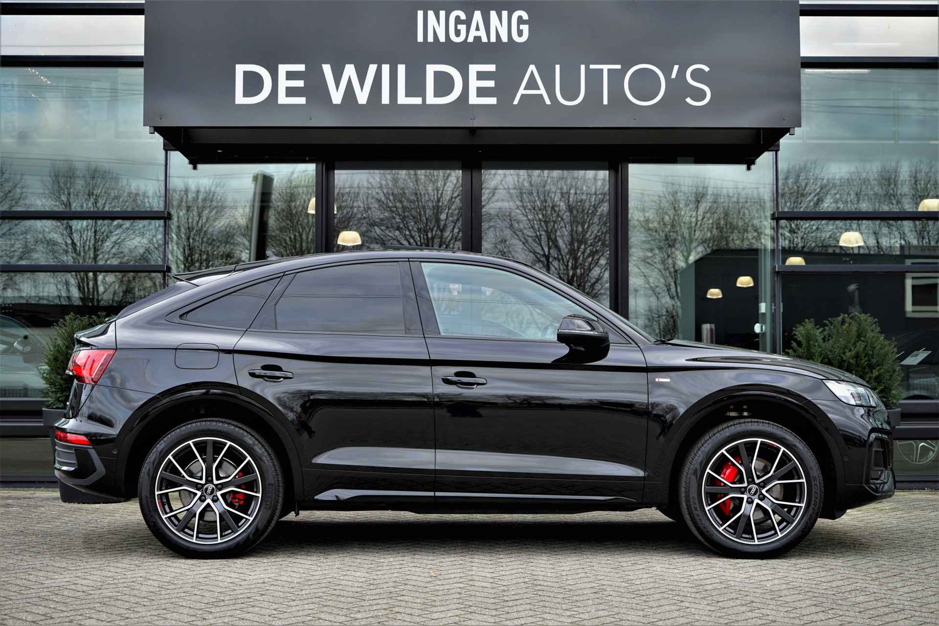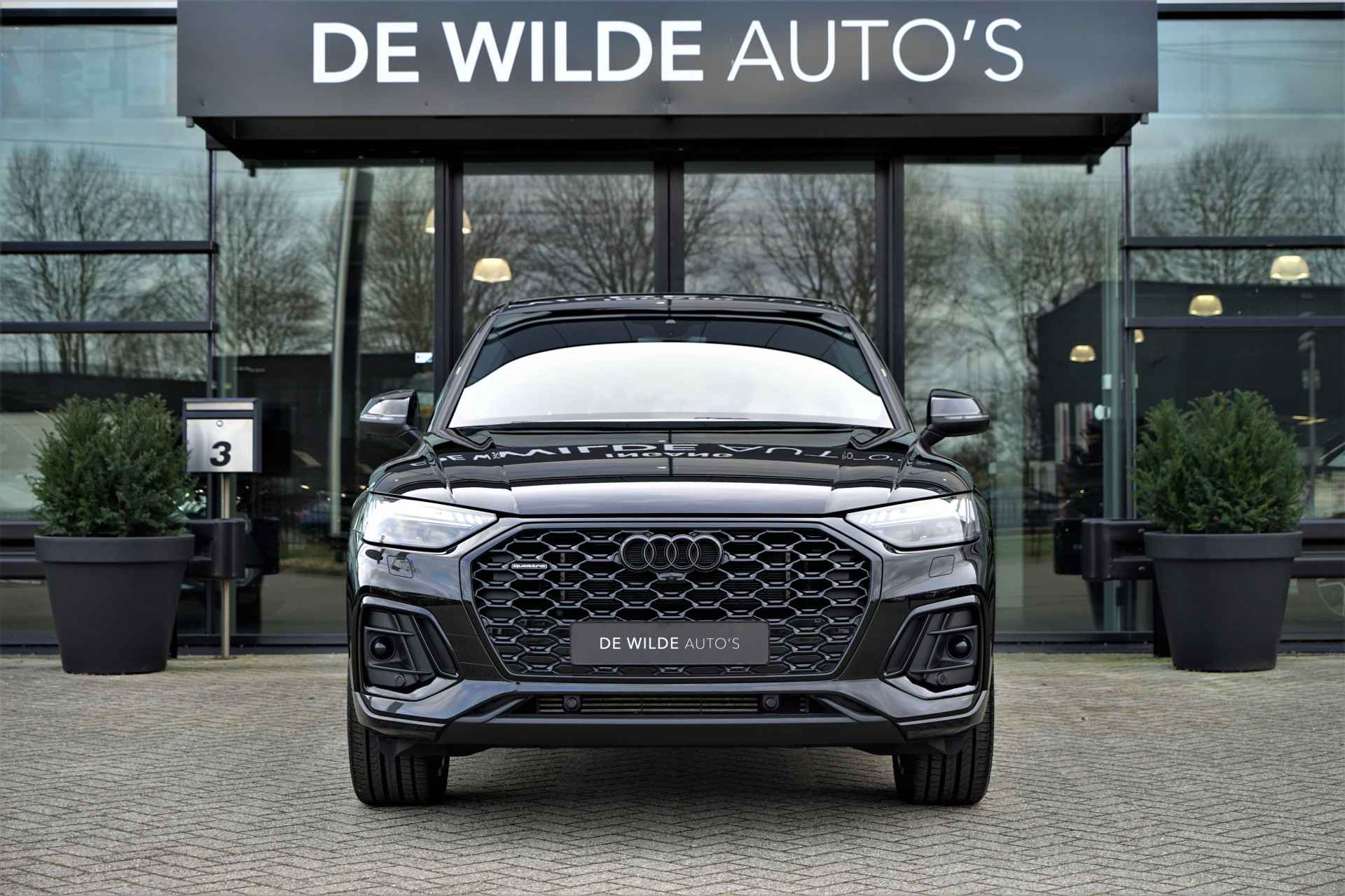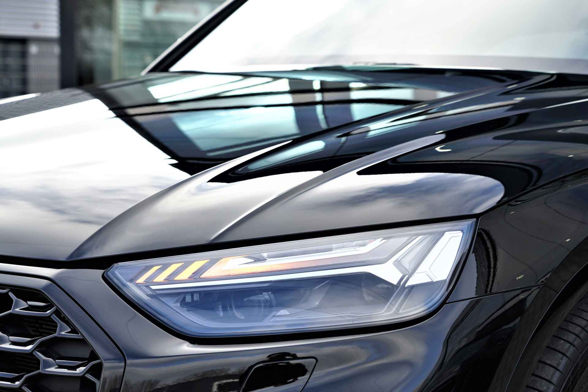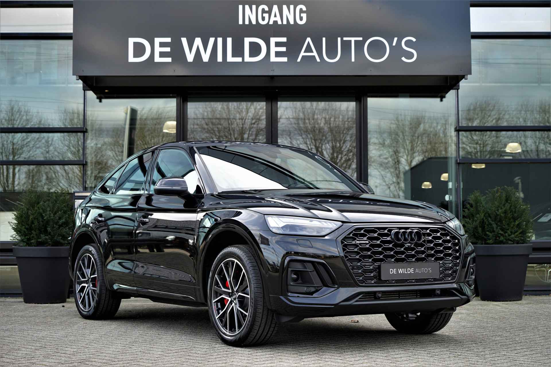 Audi Q5 Sportback 50 TFSI e Quattro S-line in de kleur 'Mythoszwart metallic'. De auto is compleet Audi dealer onderhouden en heeft slechts één eigenaar gehad.