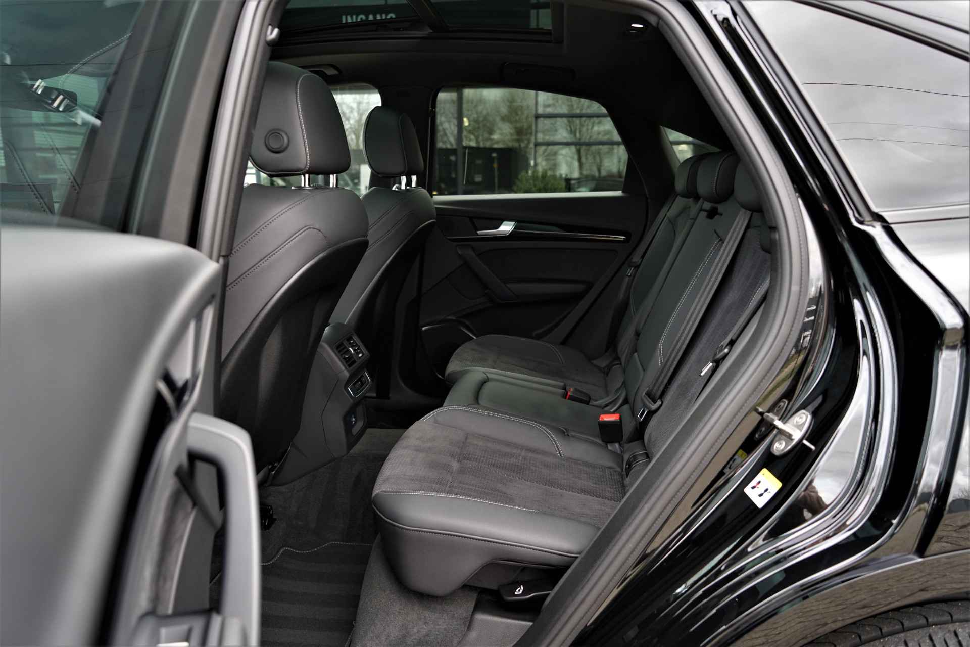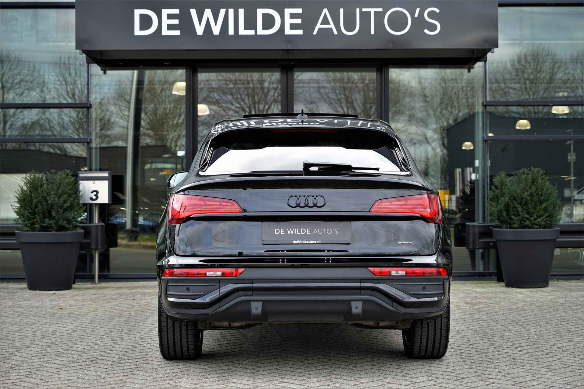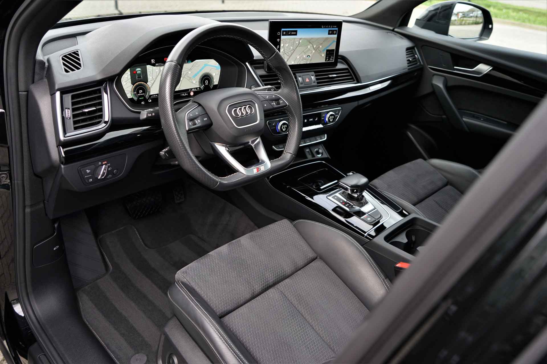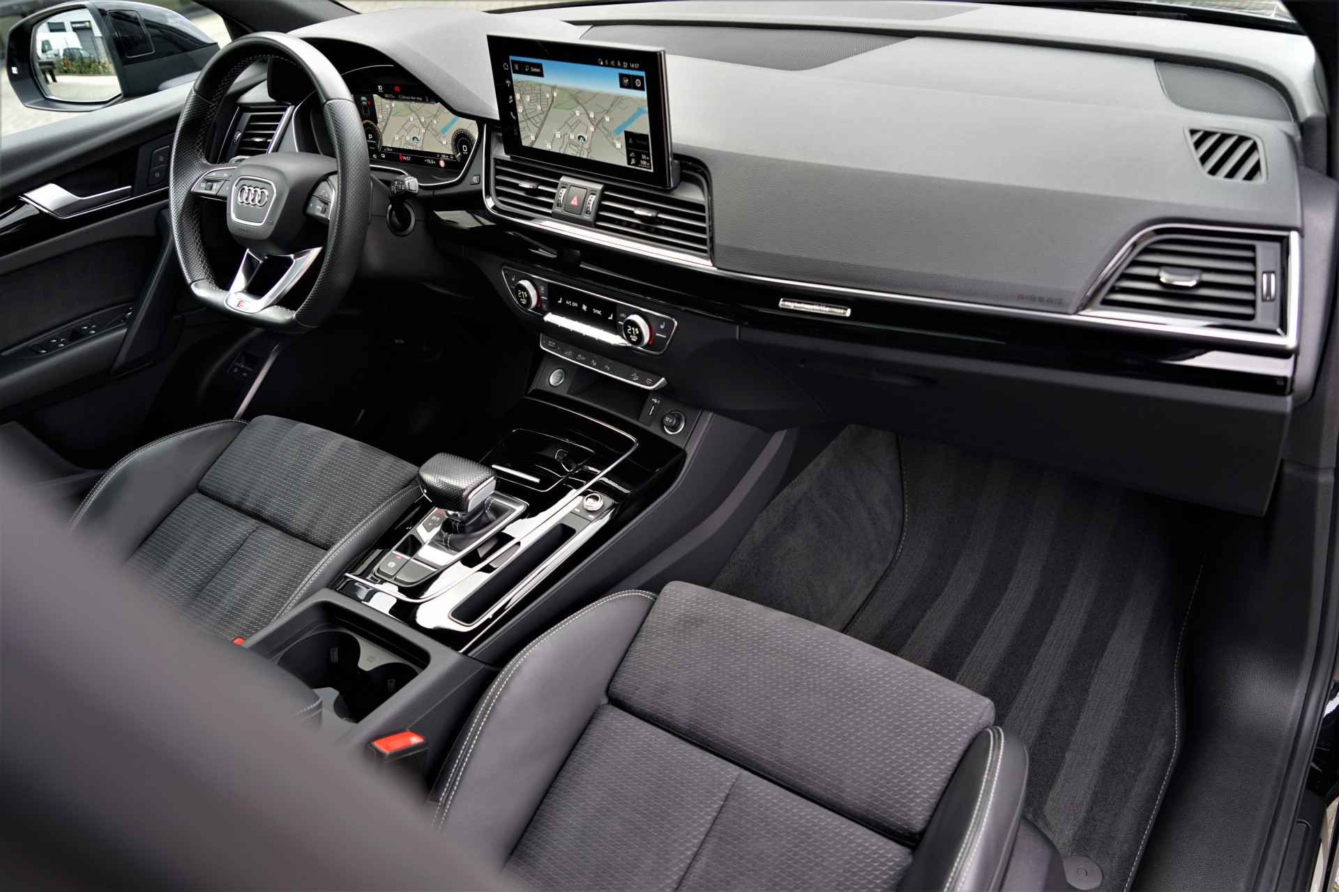 Audi Q5 Sportback 50 TFSI e Quattro S-line in de kleur 'Mythoszwart metallic'. De auto is compleet Audi dealer onderhouden en heeft slechts één eigenaar gehad.