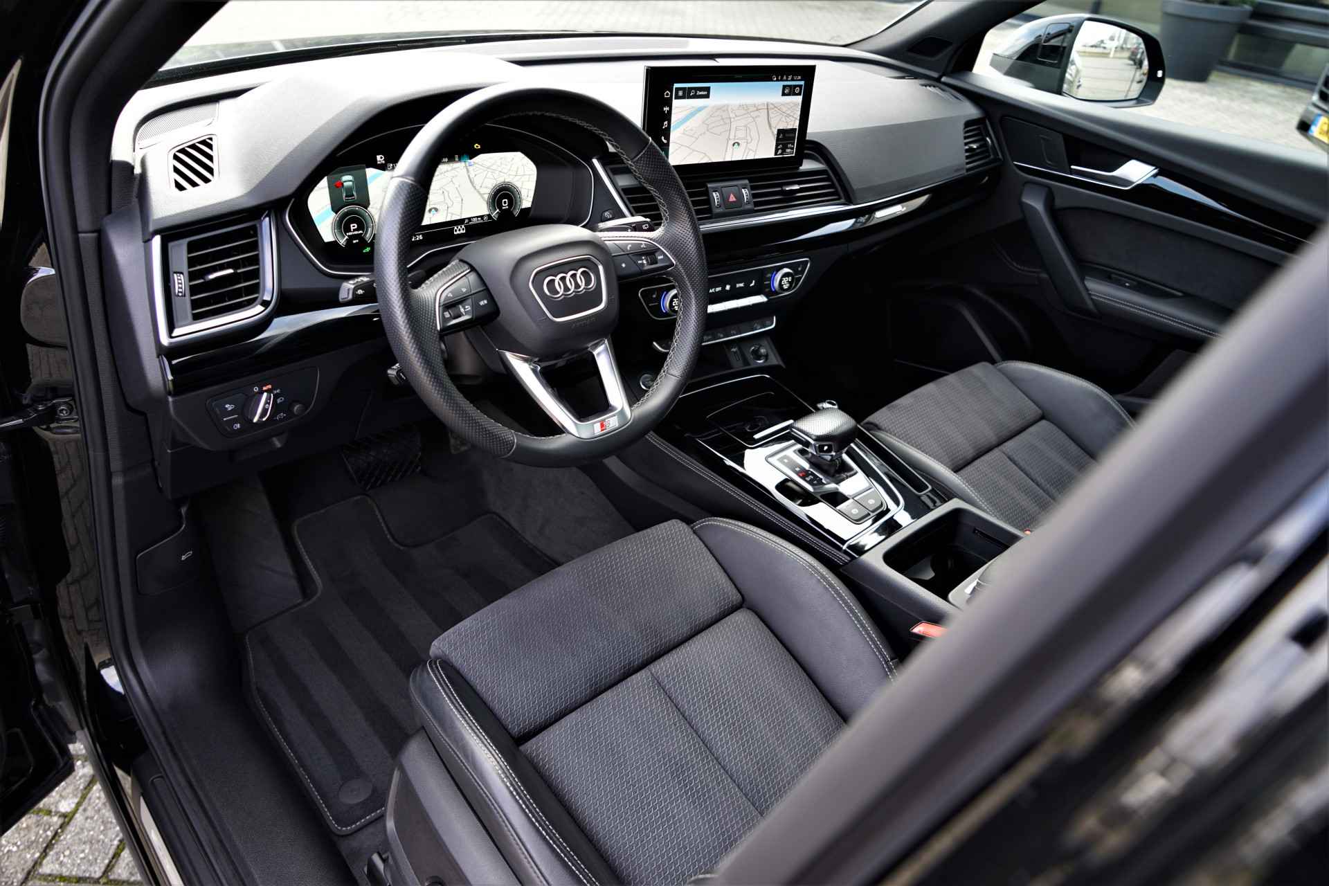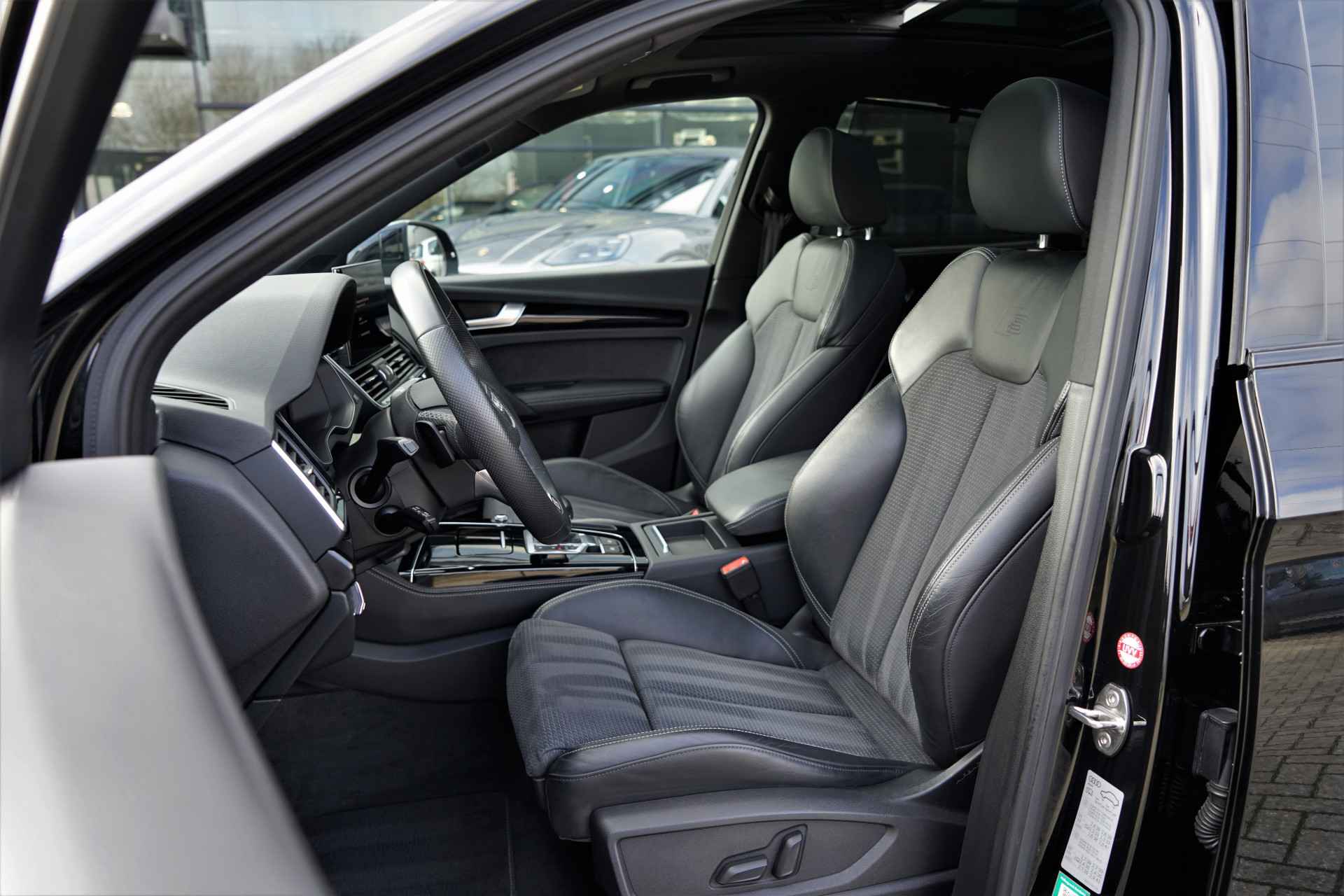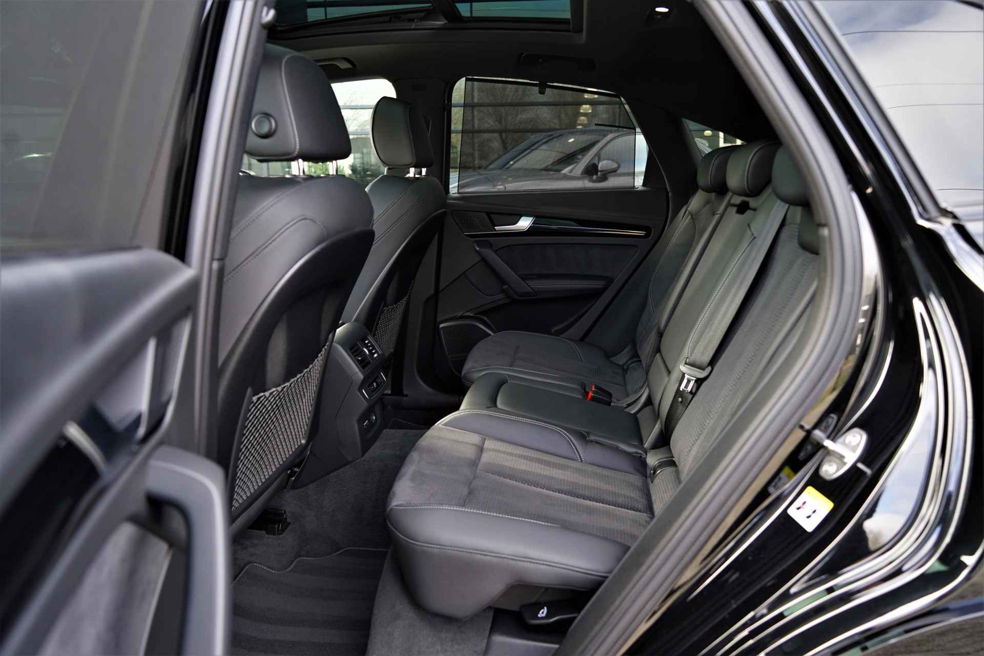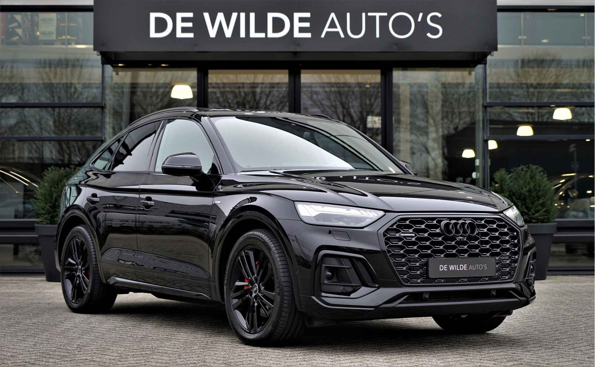 Facelift-versie Audi Q5 sportback Competition 55 TFSI e Quattro S-line in de kleur 'Mythoszwart metallic'. De auto is compleet Audi dealer onderhouden en heeft slechts één eigenaar gehad.