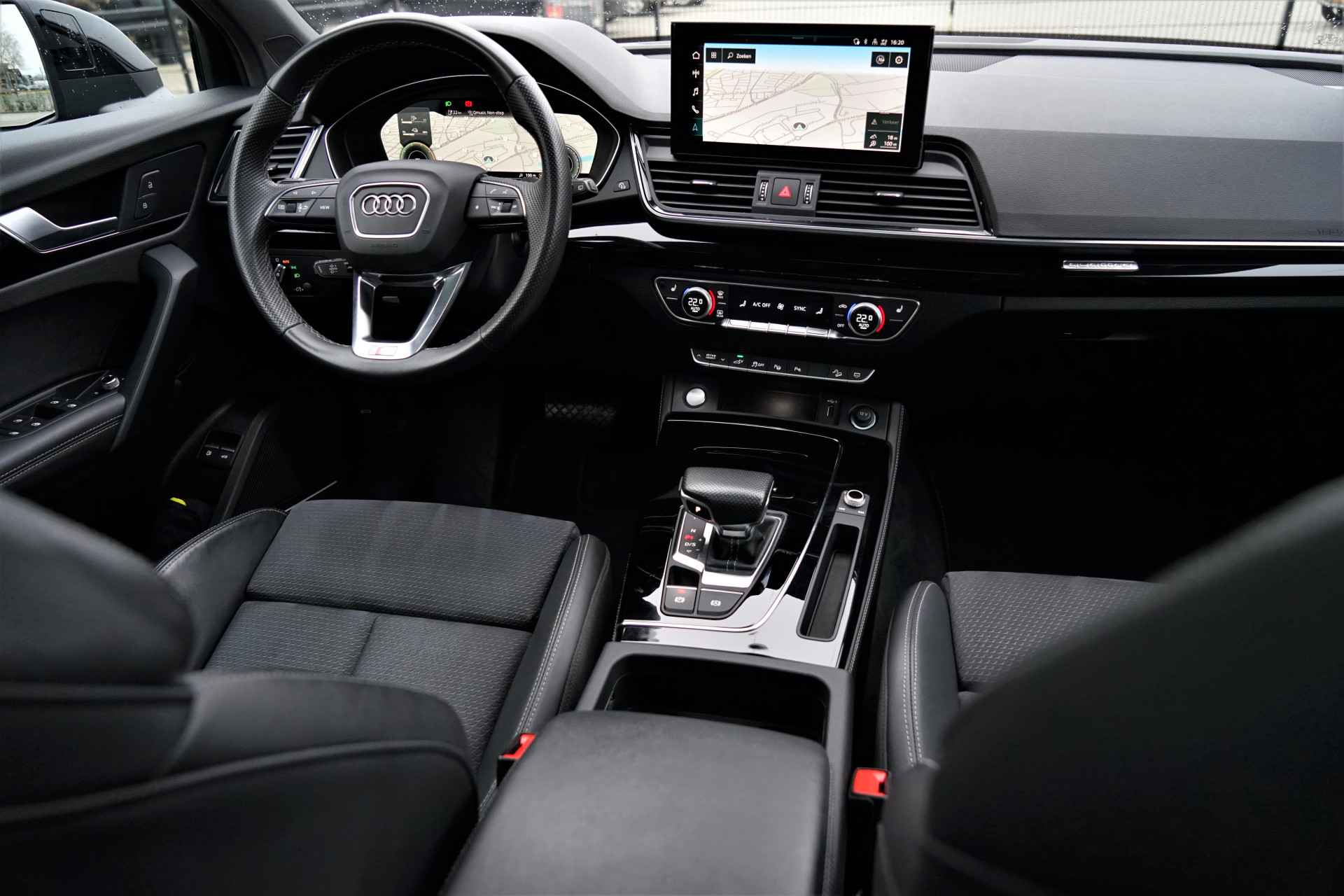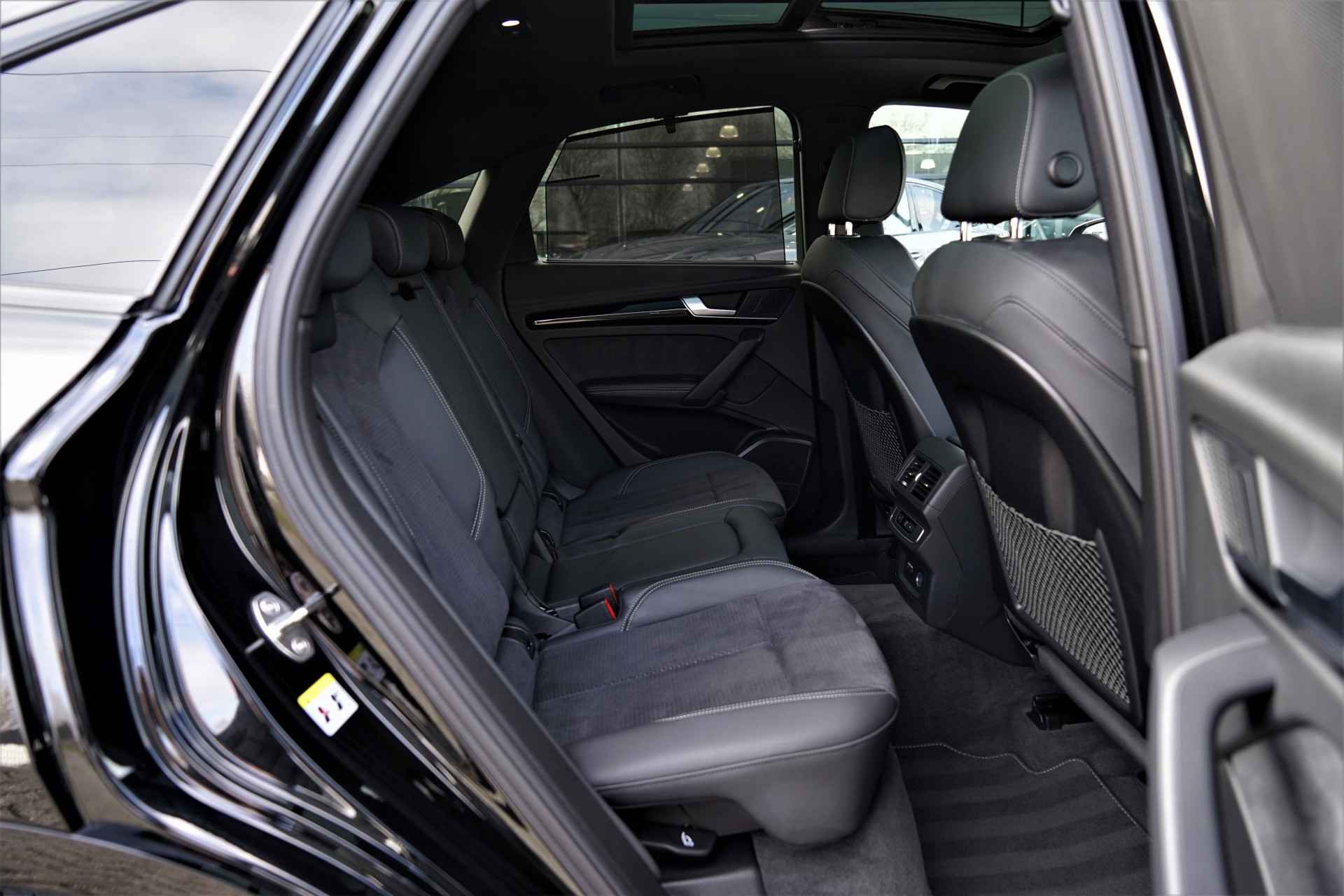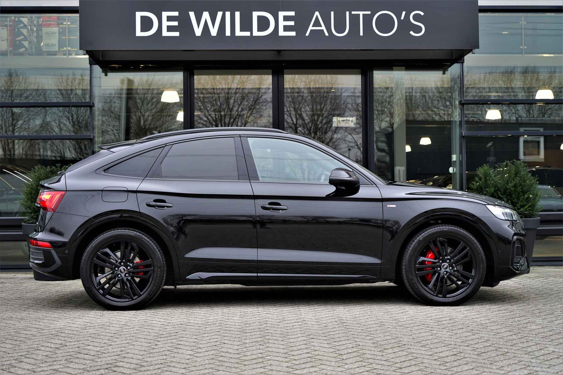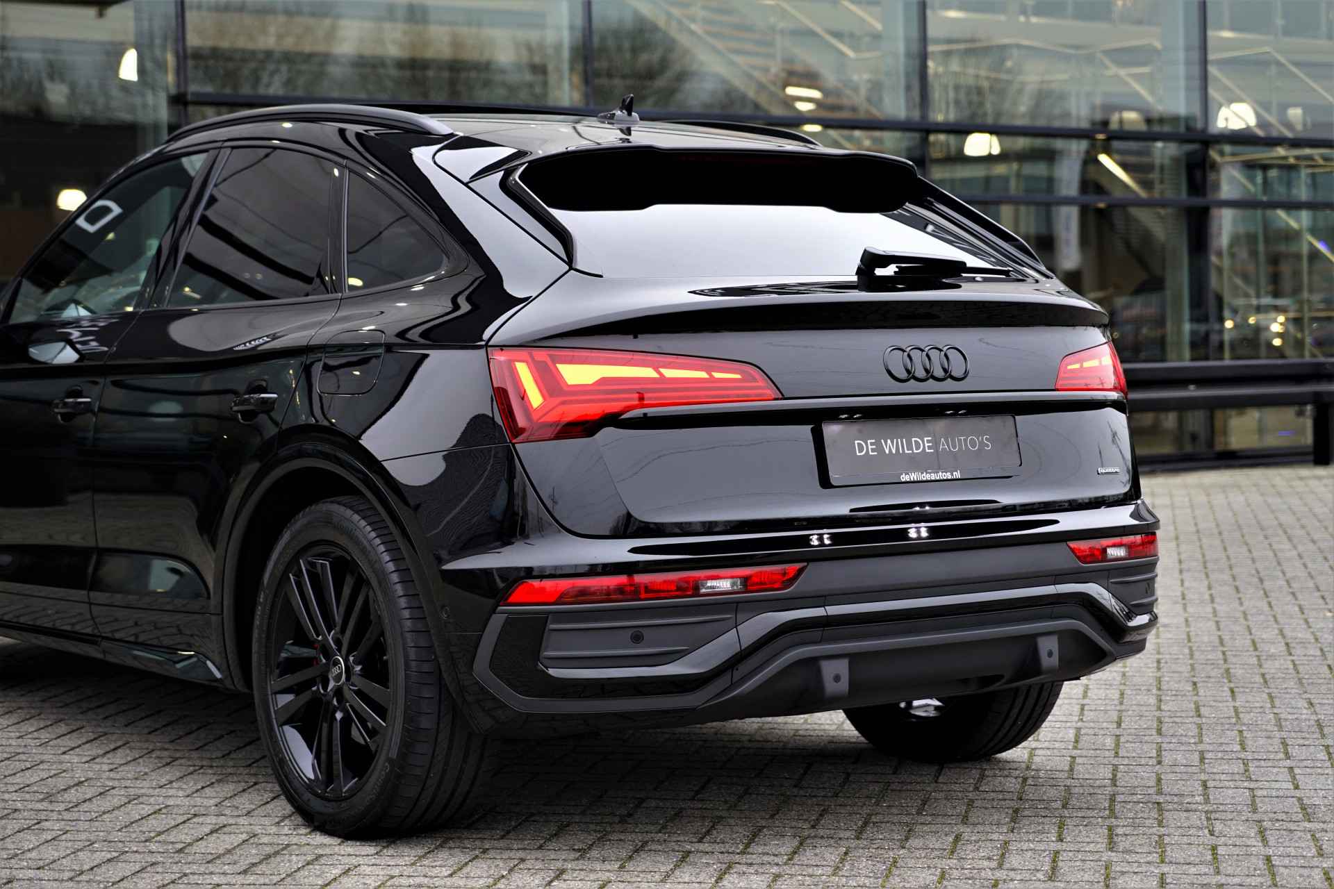 Facelift-versie Audi Q5 sportback Competition 55 TFSI e Quattro S-line in de kleur 'Mythoszwart metallic'. De auto is compleet Audi dealer onderhouden en heeft slechts één eigenaar gehad.