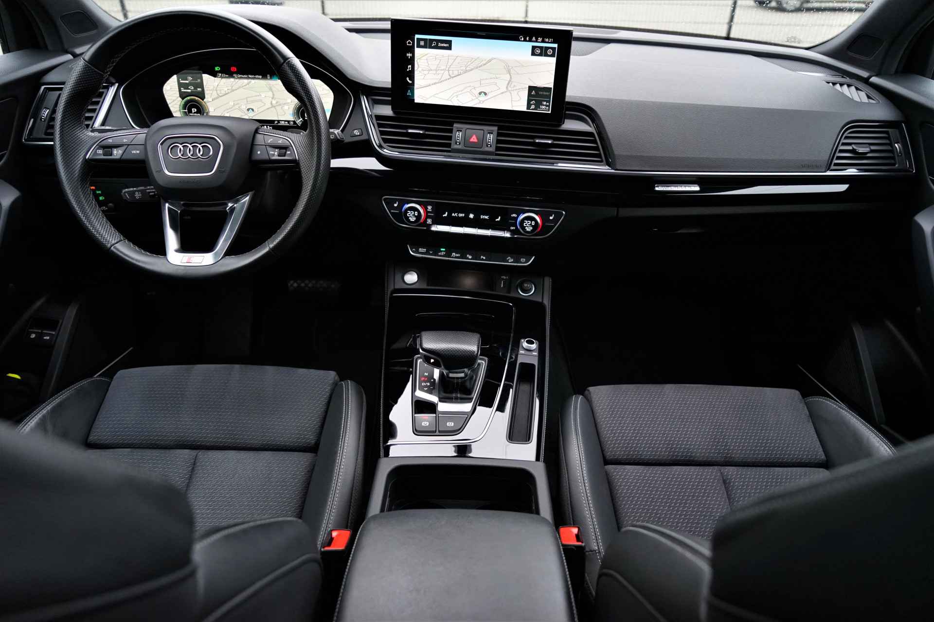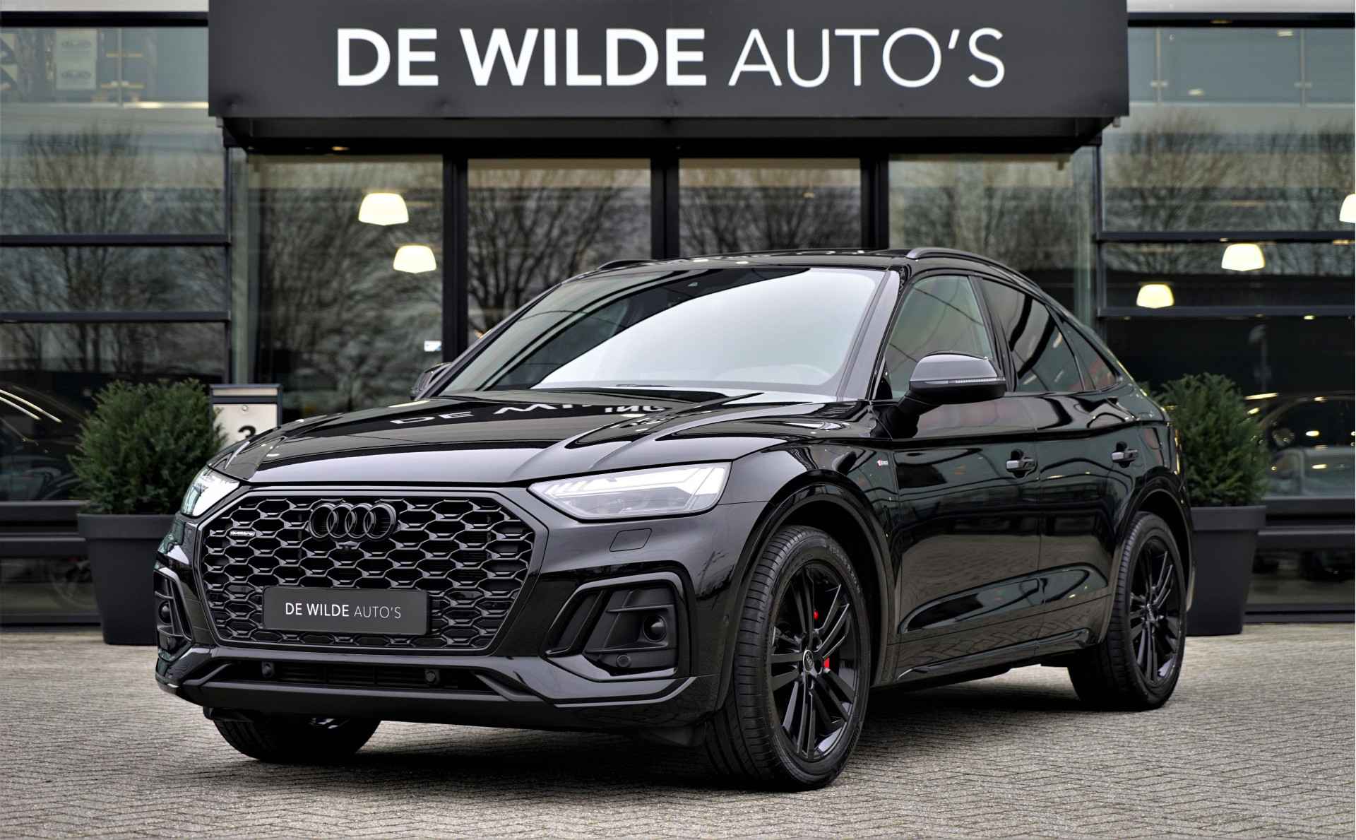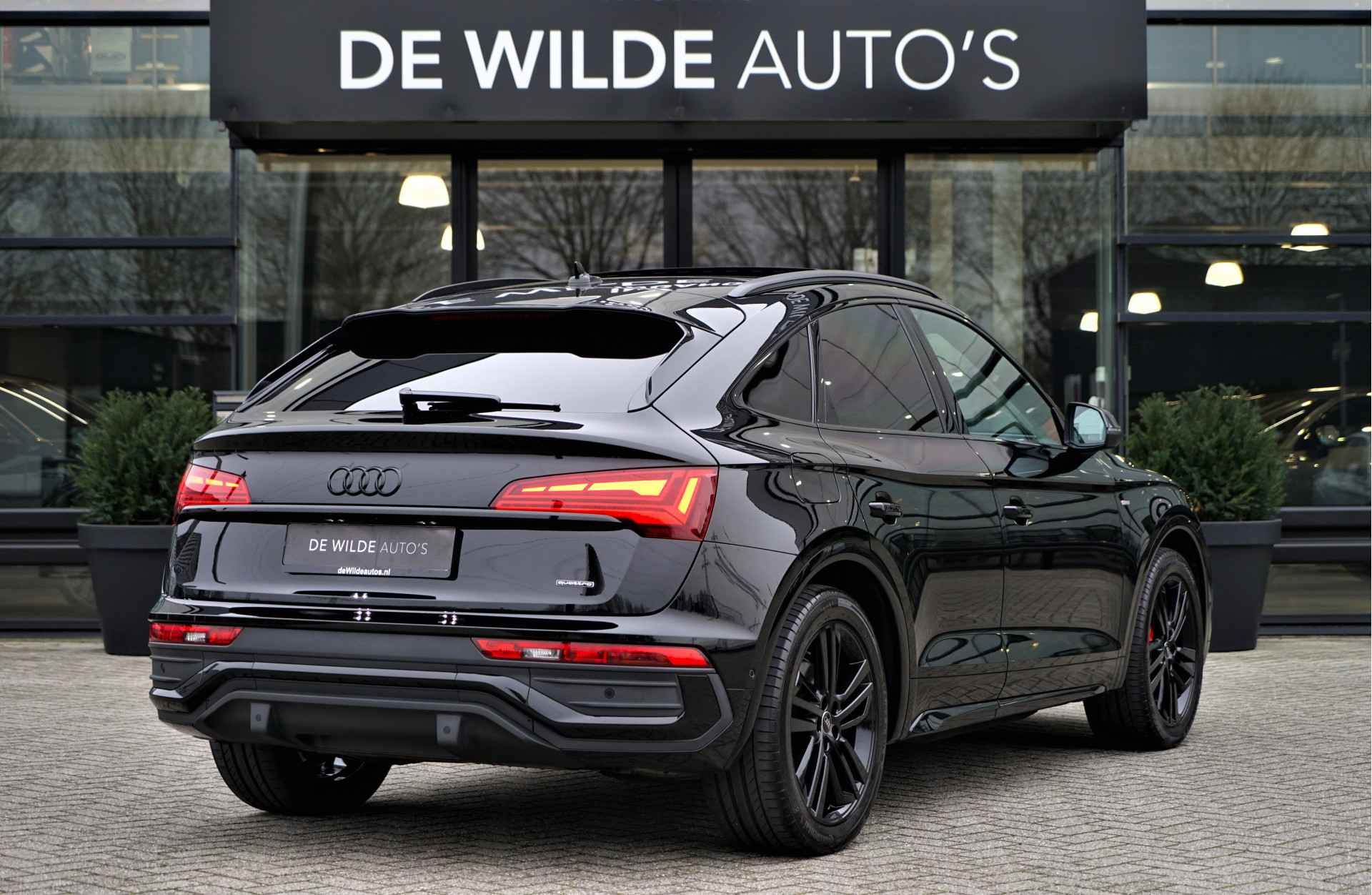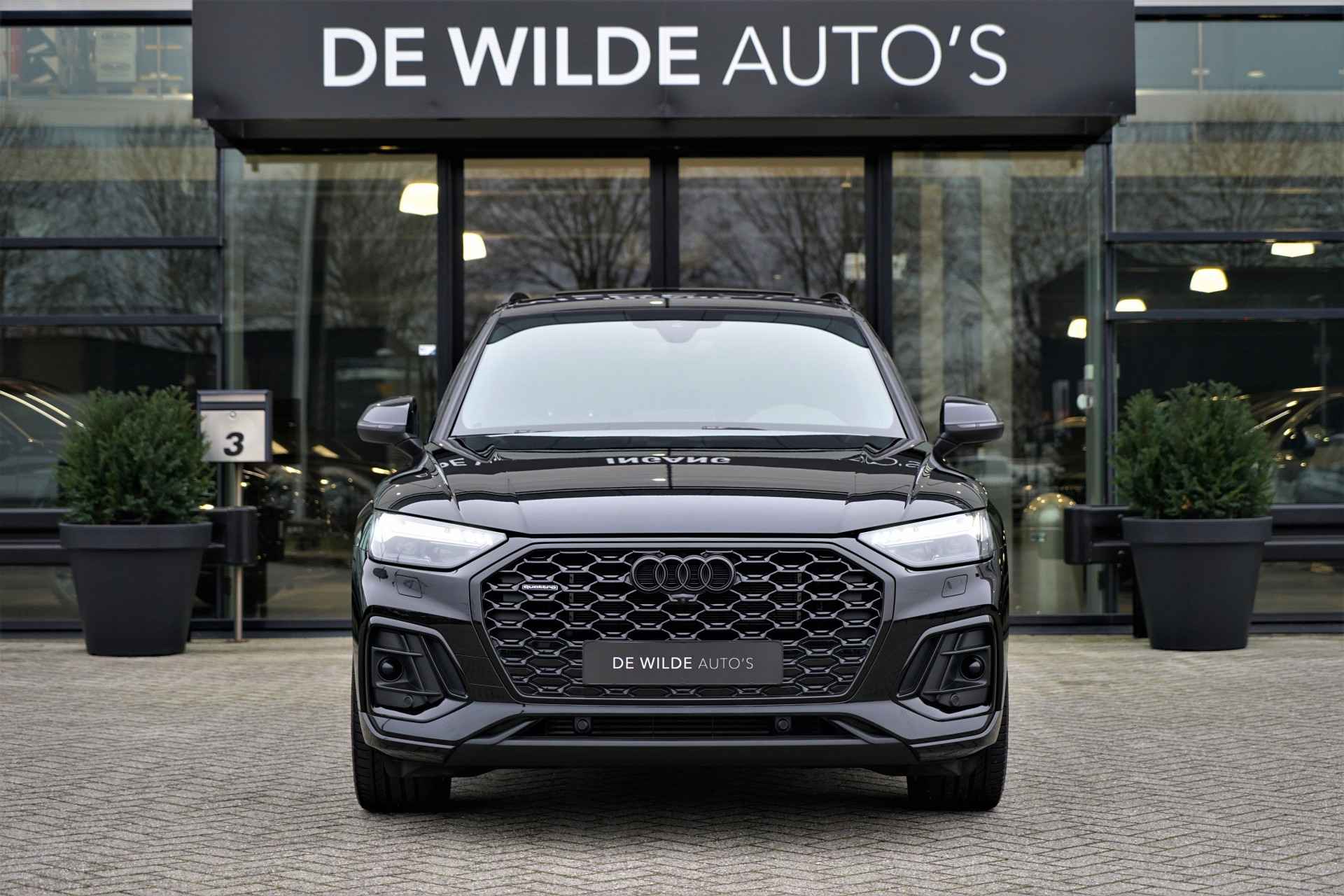 Facelift-versie Audi Q5 sportback Competition 55 TFSI e Quattro S-line in de kleur 'Mythoszwart metallic'. De auto is compleet Audi dealer onderhouden en heeft slechts één eigenaar gehad.
