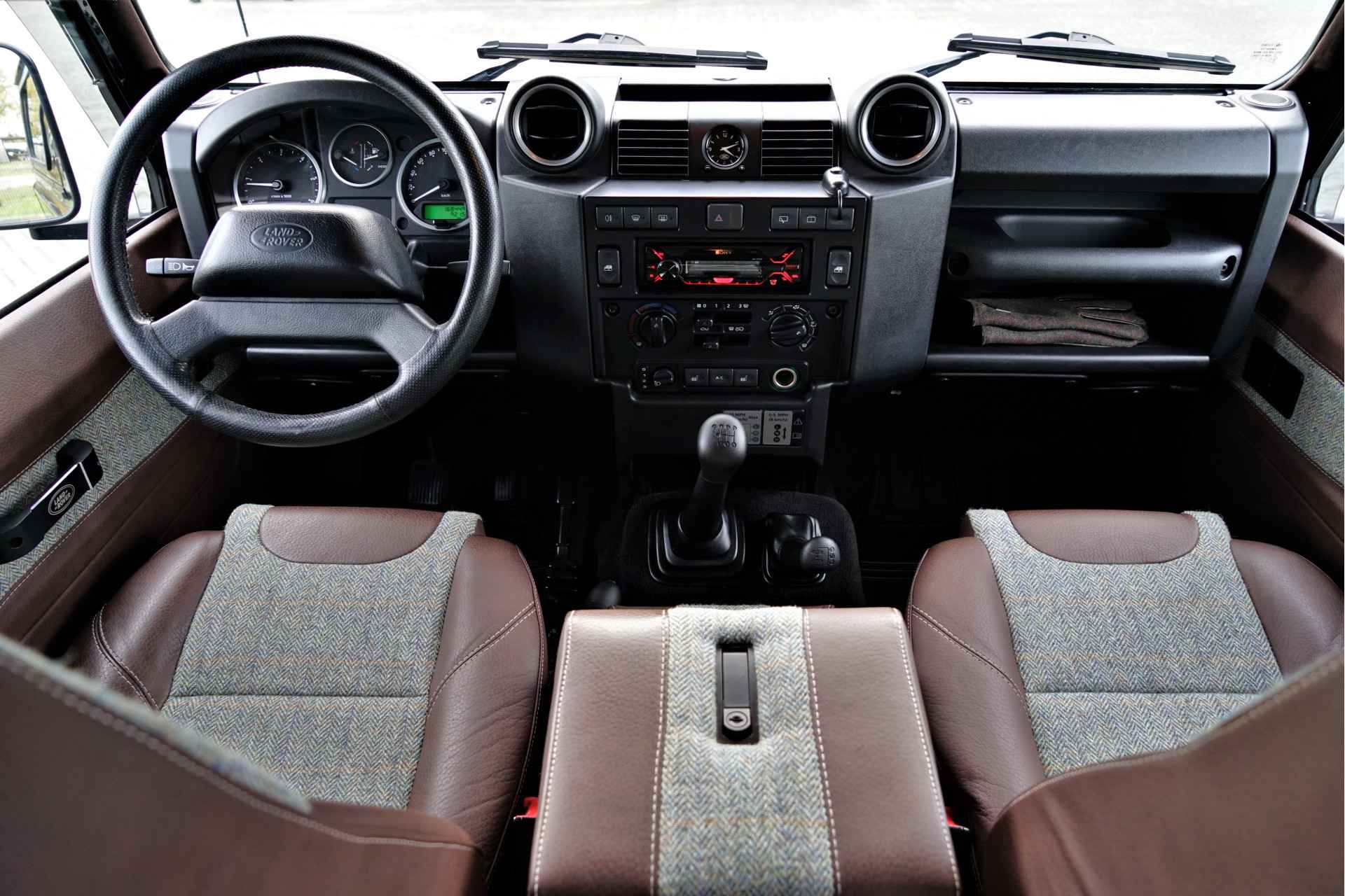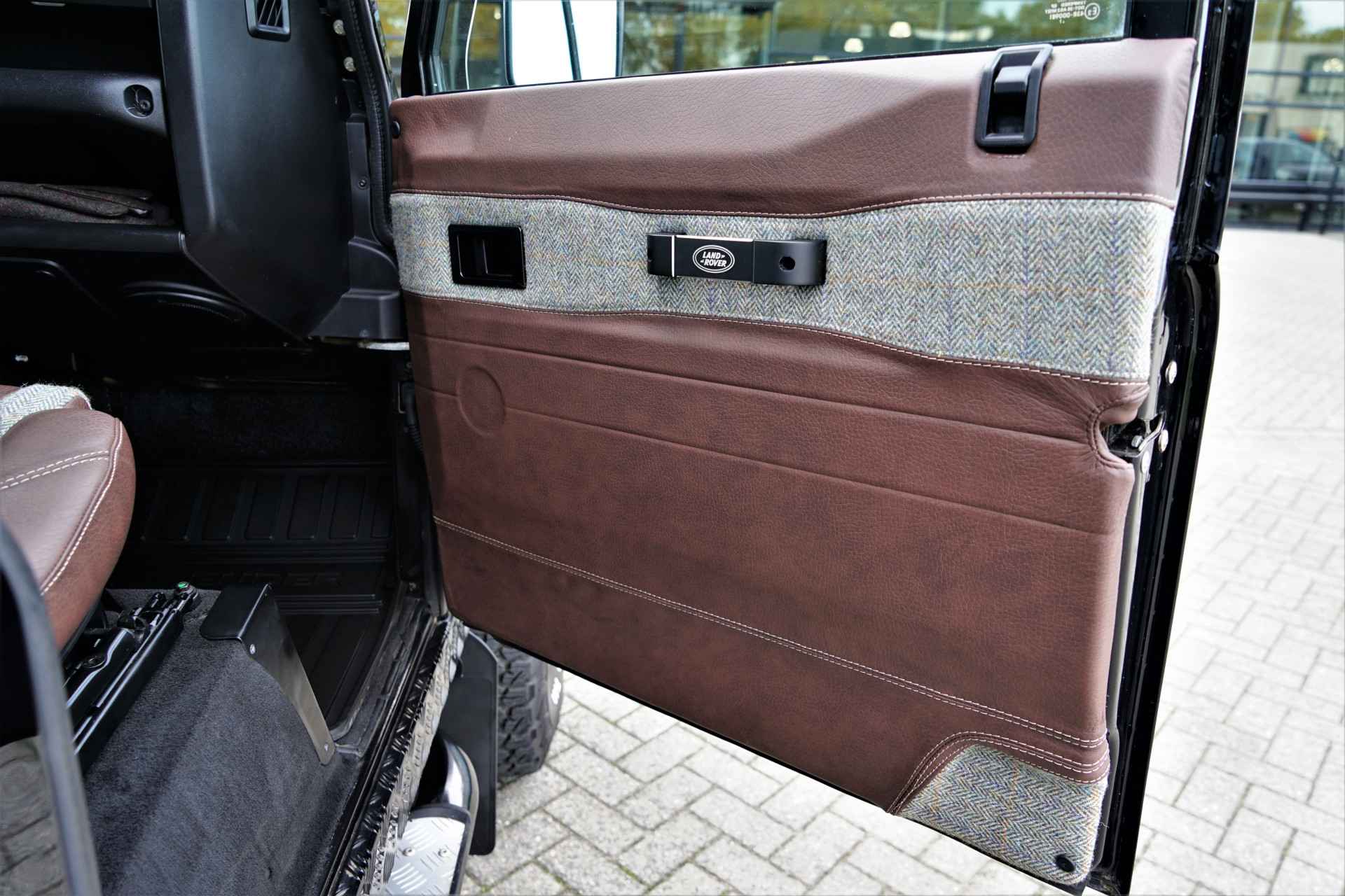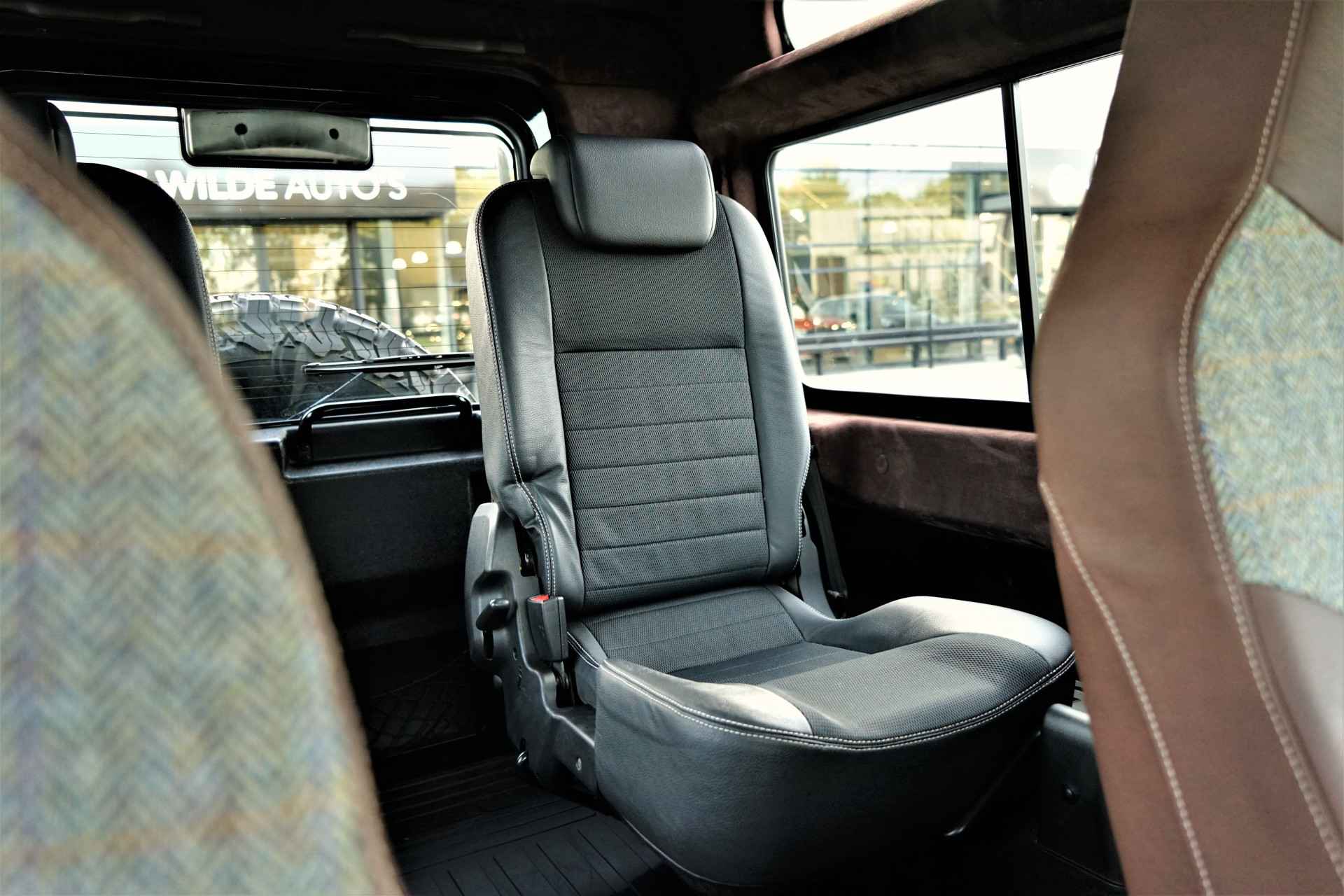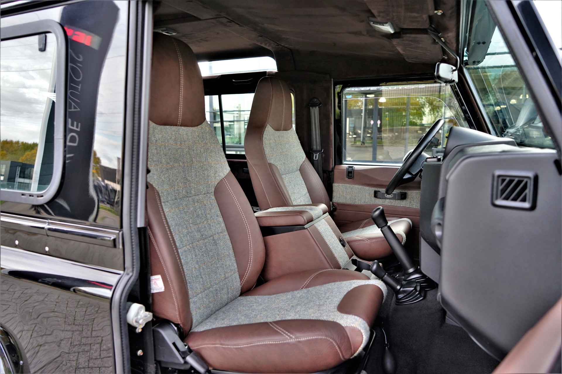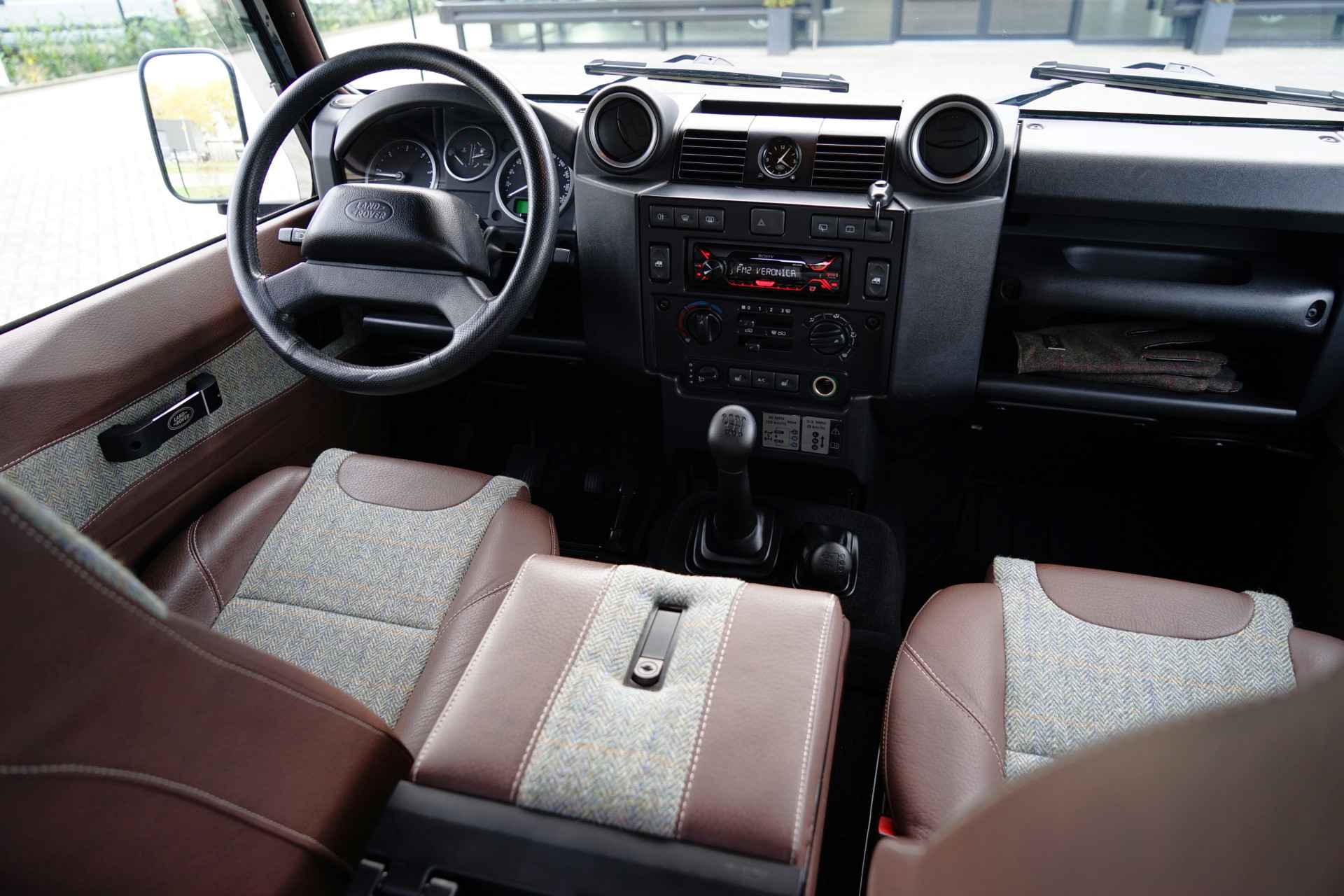 Unieke Land Rover Defender 2.4 TD 90 4-persoons op geel-kenteken. De Defender is voorzien van een Harris Tweed interieur, waarbij de karakteristieke wolstof terugkomt in de stoelen, middenarmsteun en deurpanelen. Daarnaast is de complete dakhemel en B-stijl 'custom' afgewerkt in 'Brown Velvet'.