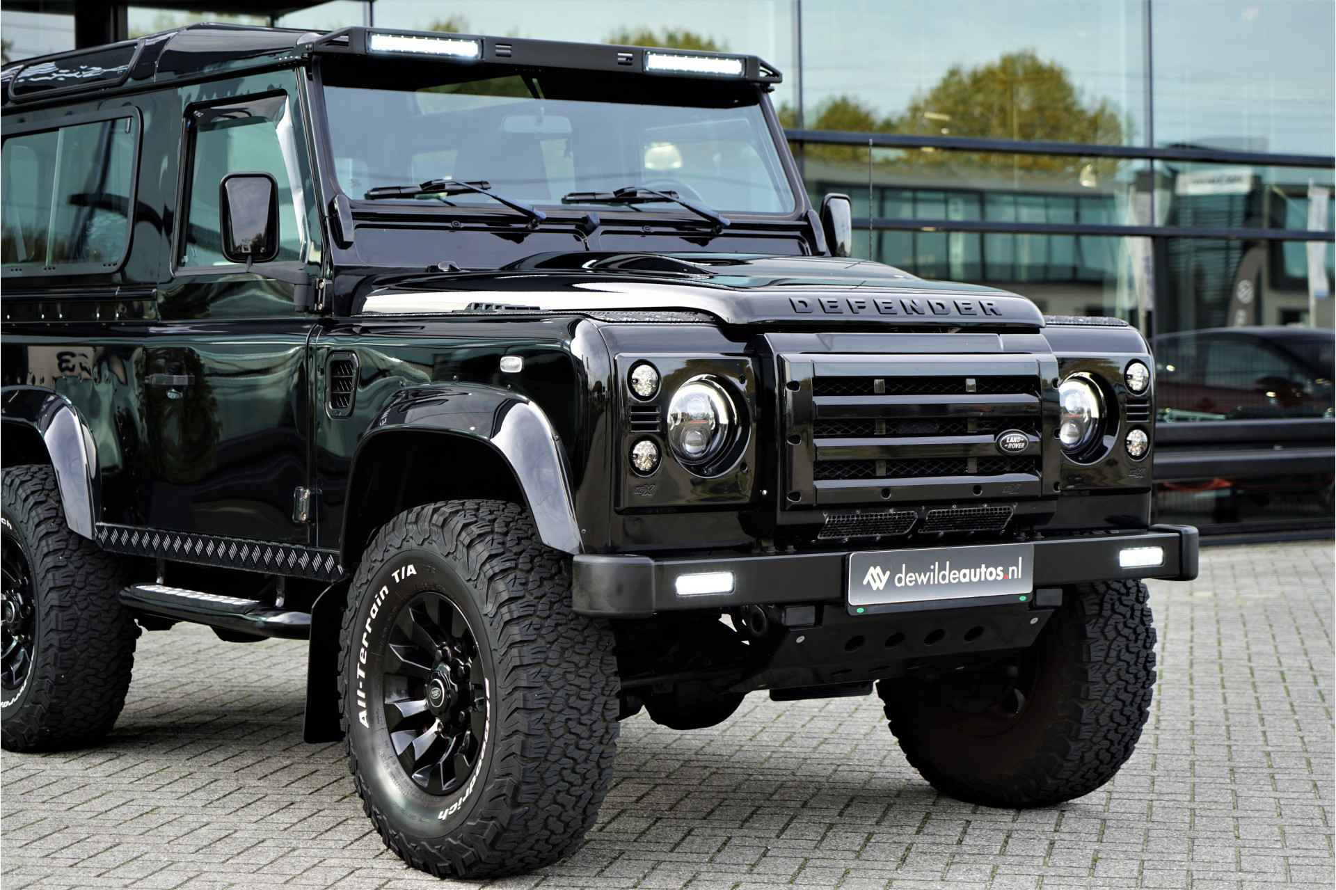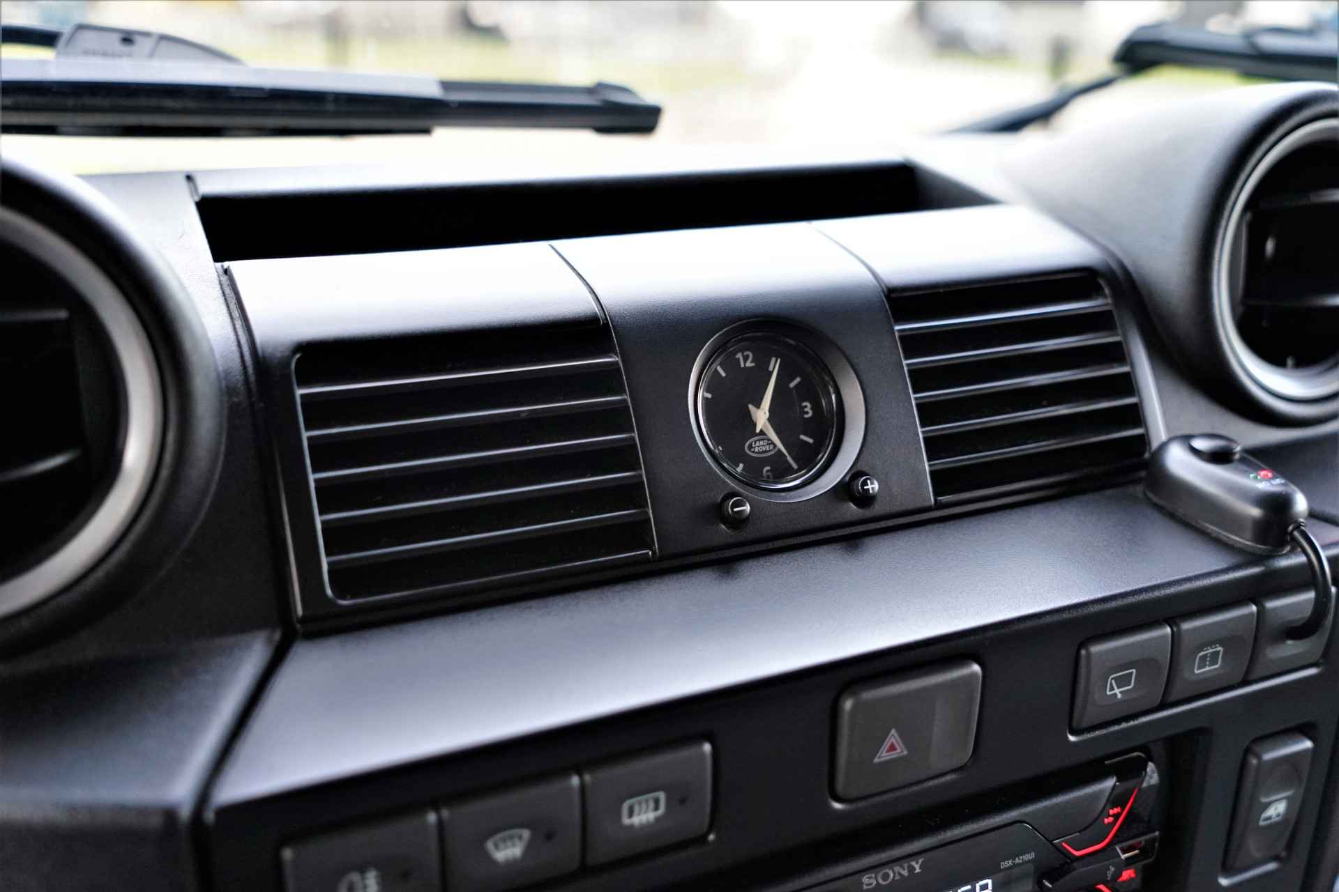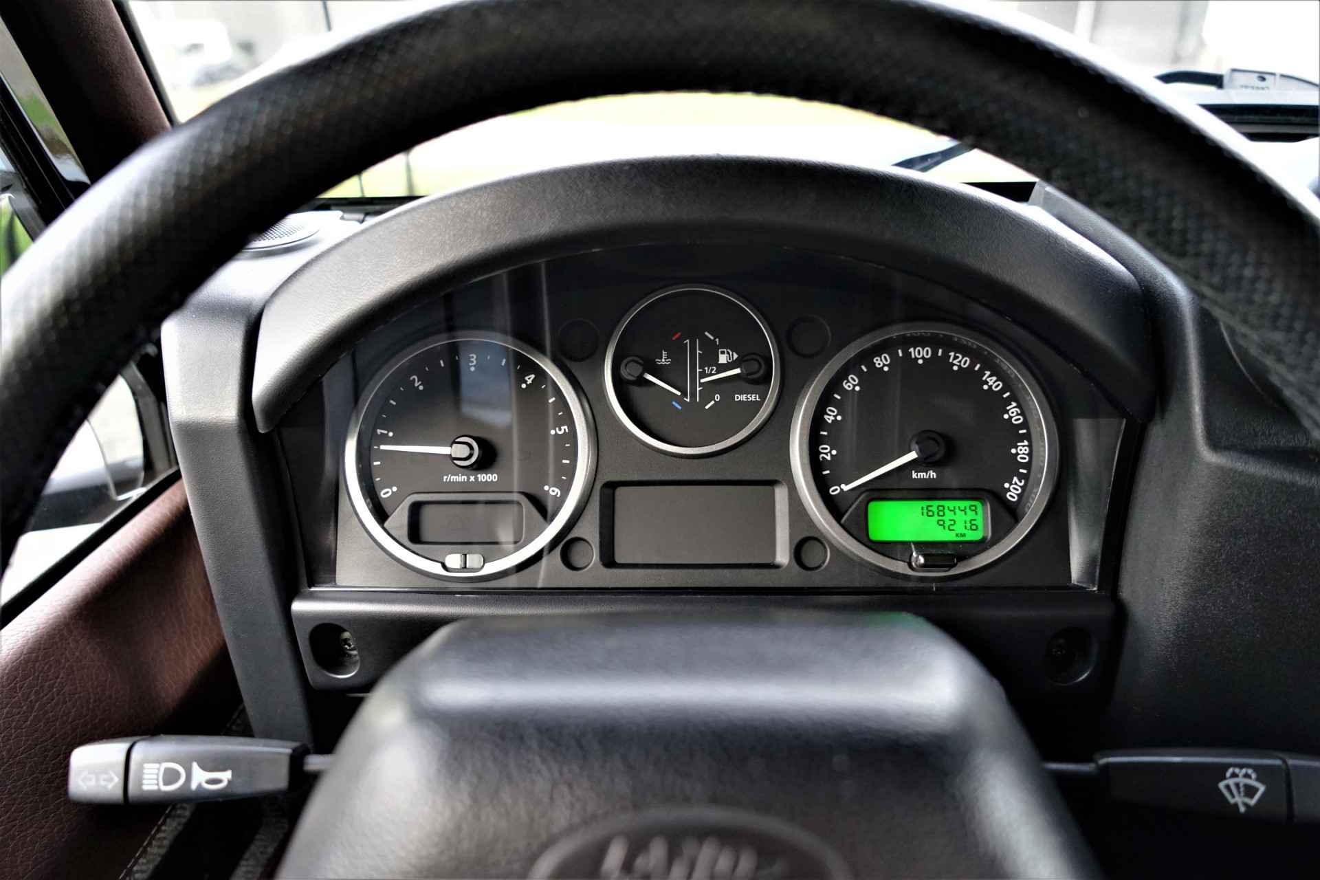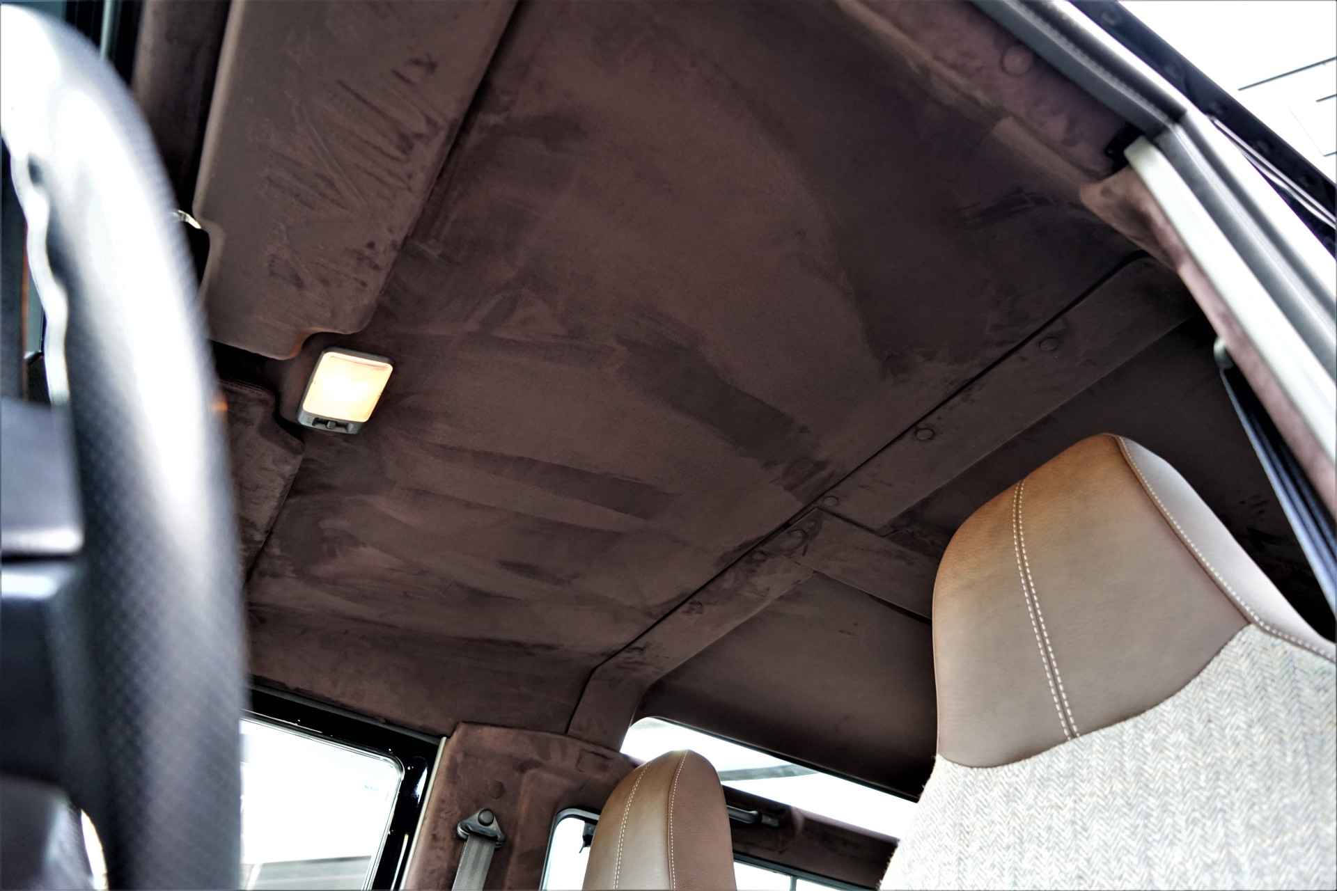 Unieke Land Rover Defender 2.4 TD 90 4-persoons op geel-kenteken. De Defender is voorzien van een Harris Tweed interieur, waarbij de karakteristieke wolstof terugkomt in de stoelen, middenarmsteun en deurpanelen. Daarnaast is de complete dakhemel en B-stijl 'custom' afgewerkt in 'Brown Velvet'.