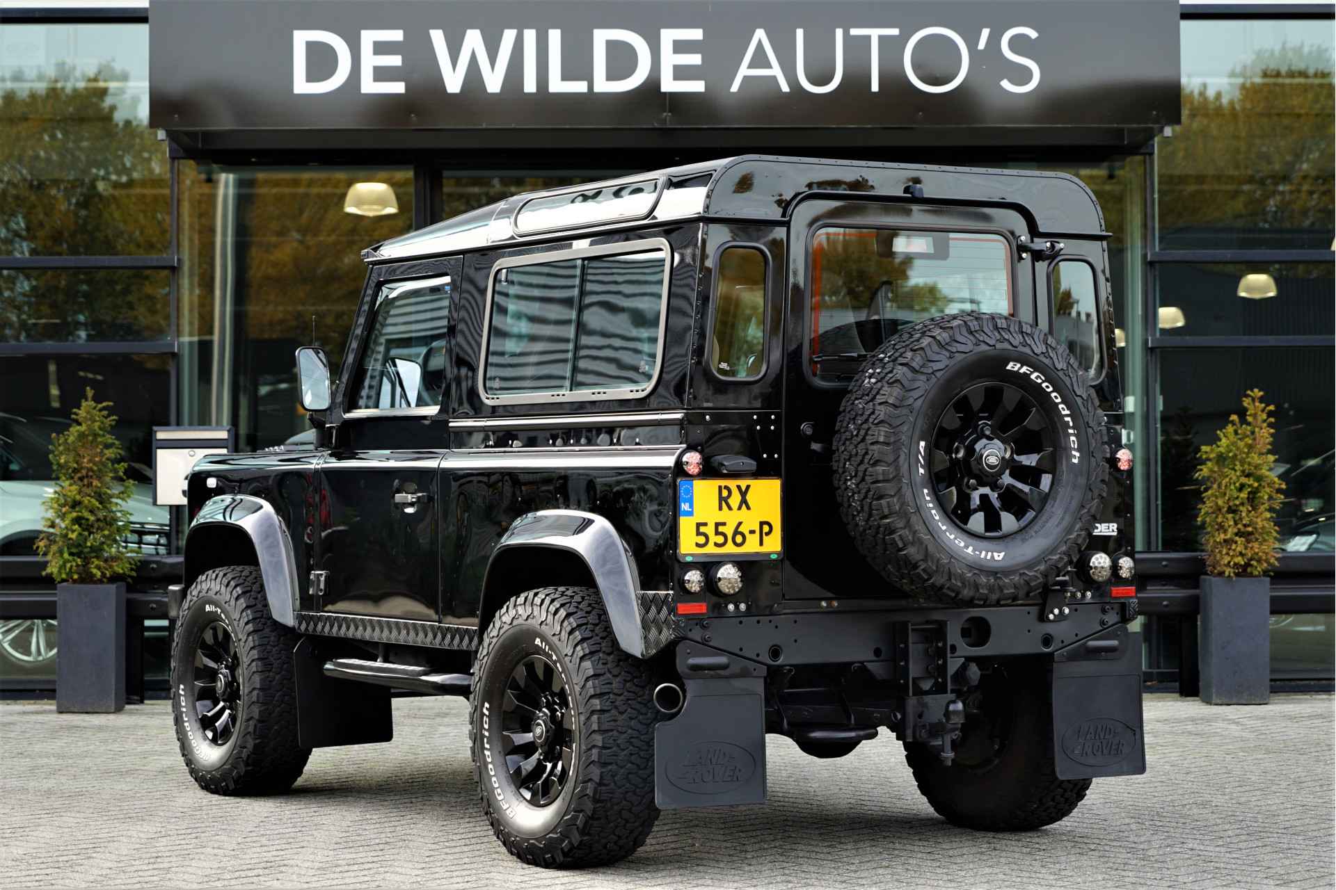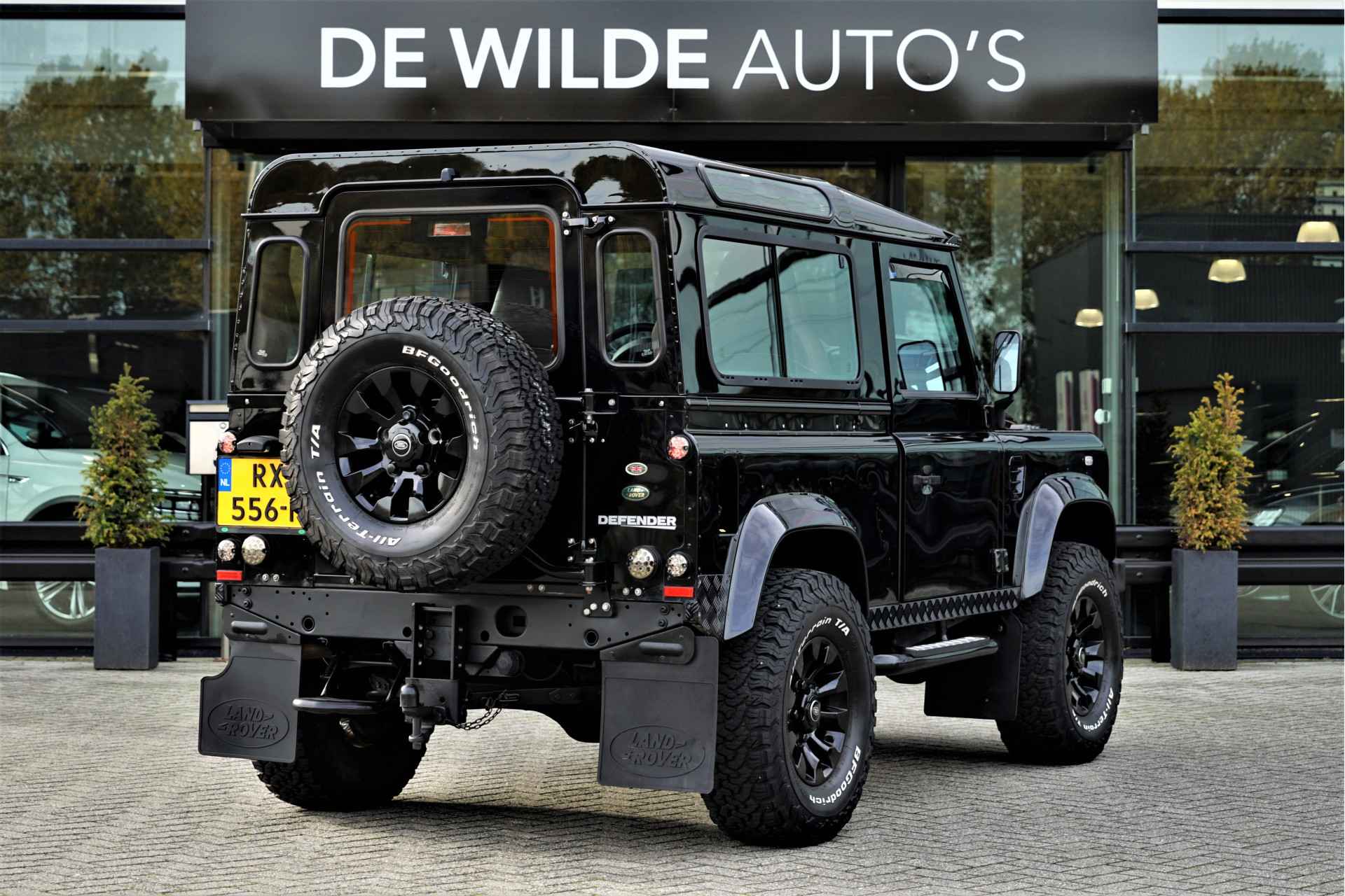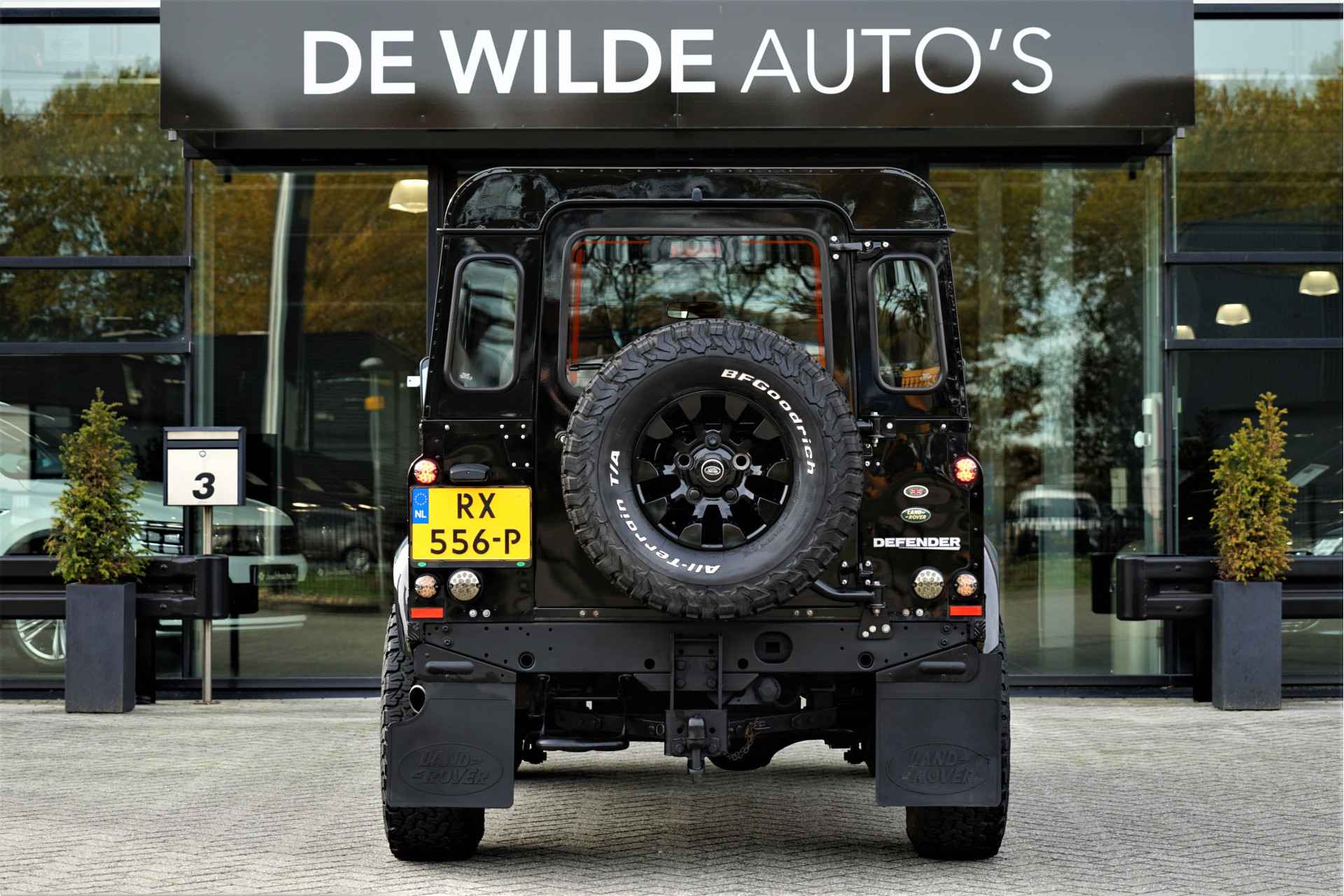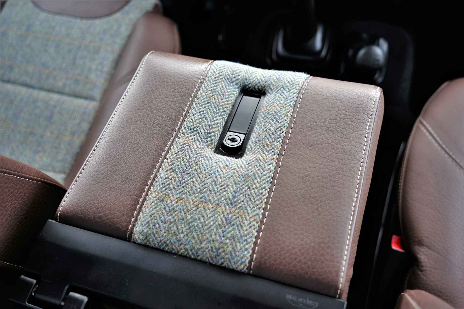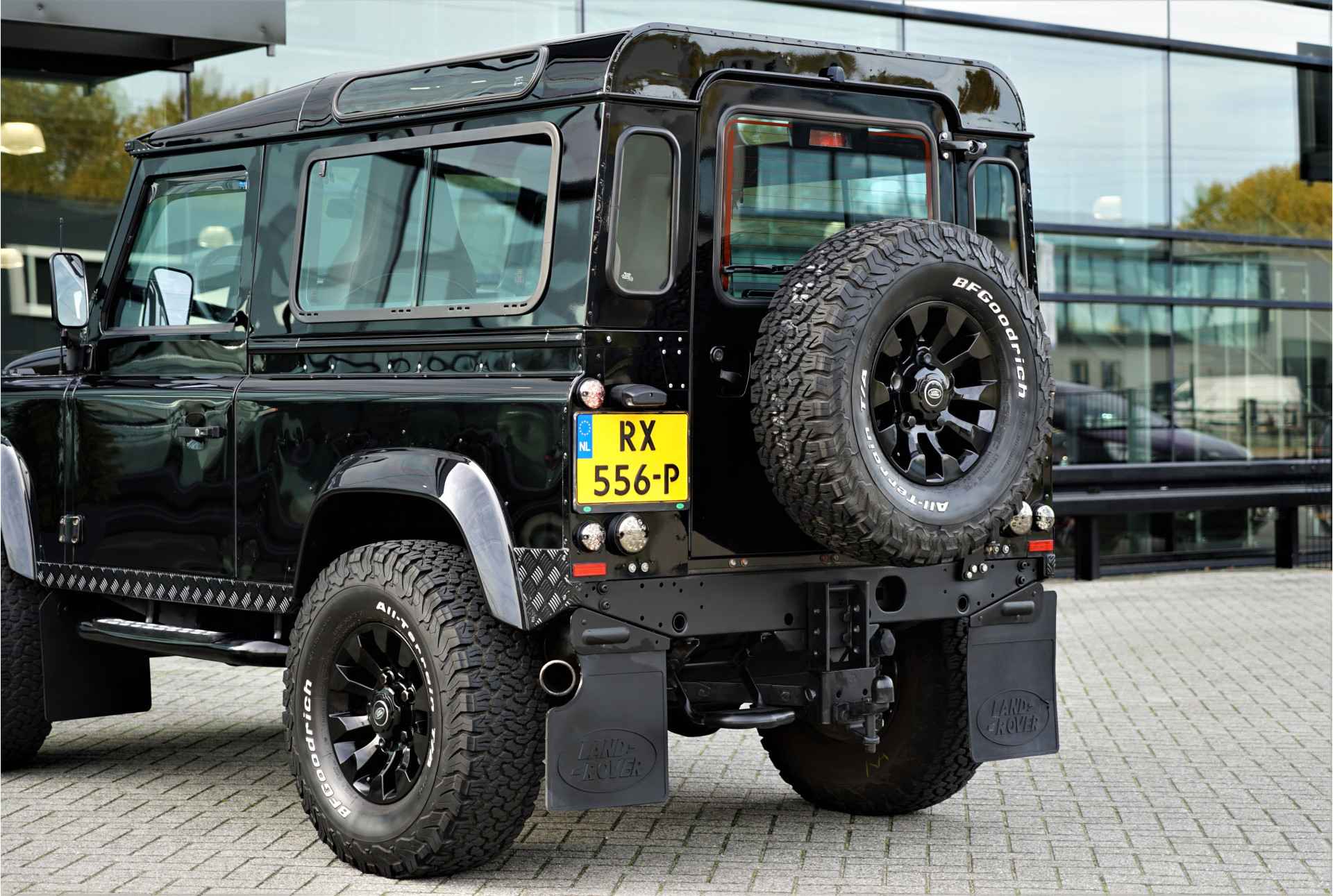Unieke Land Rover Defender 2.4 TD 90 4-persoons op geel-kenteken. De Defender is voorzien van een Harris Tweed interieur, waarbij de karakteristieke wolstof terugkomt in de stoelen, middenarmsteun en deurpanelen. Daarnaast is de complete dakhemel en B-stijl 'custom' afgewerkt in 'Brown Velvet'.